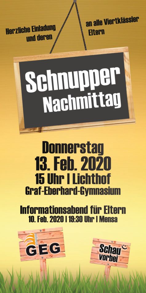 Schon eine halbe Stunde vor dem eigentlichen Beginn des diesjährigen Schnuppertags am Graf-Eberhard-Gymnasium trudelten die ersten interessierten Viertklässler mitsamt Eltern und Geschwistern im Lichthof der Schule ein. Direktor Friedemann Schlumberger begrüßte die Gäste persönlich und riet ihnen genau zu überlegen, was sie sich von einer weiterführende Schule wünschen. Im zweiten Schritt sollen die künftigen Fünftklässler, entsprechend unseres Schulmottos „Attempto“, wagemutig und neugierig ihre Wahl treffen. Weiter ging es musikalisch: Der Fünfer-Chor unter der Leitung von Joachim Teufel und die Hip-Hop-AG unter der Leitung von Alexandra Donoth bereicherten den Nachmittag mit Gesang und Tanz und bewiesen nebenbei, dass am GEG so Einiges geboten wird.
