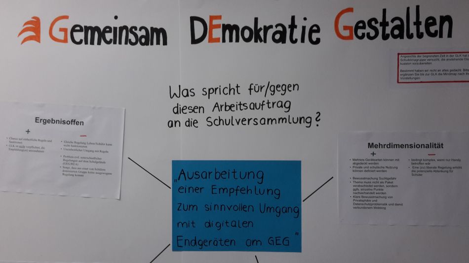 Beim SMV-Tag standen sicherlich zuerst die organisatorischen Punkte im Vordergrund, durch die Vorstellung des neuen Demokratieprojektes und der angedachten Renovierungsmaßnahmen am GEG wurde aber auch schon konkret inhaltlich gearbeitet. Vertreter der Schulklimagruppe erläuterten das ambitionierte Projekt „Gemeinsam Demokratie Gestalten“. Zudem lieferte die Versammlung eine große Menge an Vorschlägen und Anregungen, die Renovierung des GEG betreffend. Diese werden nun umgehend an die Schulleitung und die Baugruppe rückgemeldet. Das neue SMV-Jahr ist gestartet.