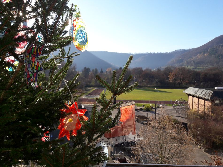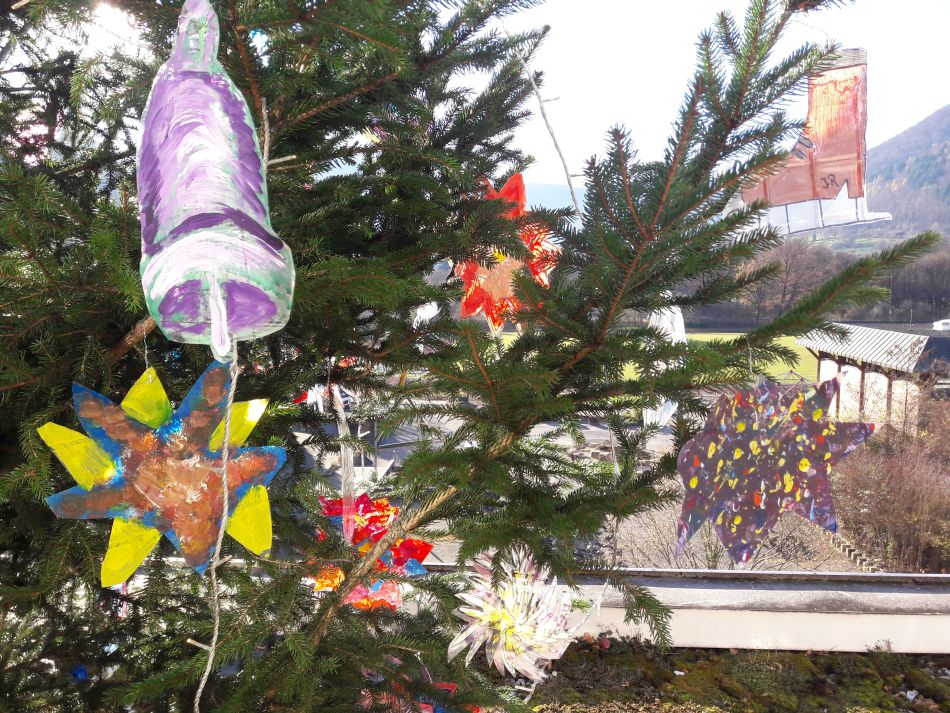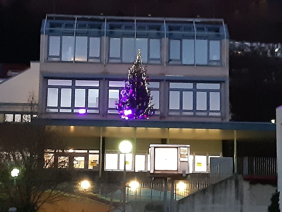 Am Donnerstag machten sich dann einige Kolleginnen und Kollegen, angeführt von Gesine Goldberg und unserem Hausmeister Peter Waimer, daran, die auserwählte Tanne bei frostigen Temperaturen, aber immerhin erwärmt durch strahlendem Sonnenschein, auf dem Vordach des Neubaus zu installieren. Auf Maskenschmuck wurde dann doch verzichtet; die Klassen 5a, 5b, 6c, 10a und 10c hatten stattdessen farbenfrohe Weihnachtsmotive in der Technik der Hinterglasmalerei auf recycelten Folien angefertigt, die nun die grünen Zweige des Baumes verschönern. Abgerundet wurde der Baumschmuck von filigranen Klangelementen, die in der „kleinen“ Kunst- AG von Ivana Juric und Mattys Meyer entstanden waren. Wer ganz genau hinhört, kann schon bei leichtem Windgang die feinen Glöckchen und mit etwas Fantasie dahinziehende Schlitten erlauschen. Auch der AK-Technik hat sein Scherflein beigetragen: In der Dunkelheit strahlen aus dem Schulhaus Scheinwerfer und tauchen die bunten Anhänger in ein wechselvolles Farbenspiel.