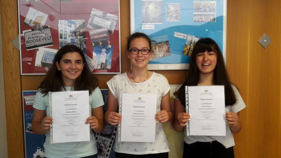 Die Teilnehmer hatten bereits vor dem eigentlichen Prüfungstag vielfältige Leistungen zu erbringen: Ein mündlicher Vortrag wurde erarbeitet und zu einem aussagekräftigen Videobeitrag verarbeitet. Dieses Video wurde eingereicht und bildete die Grundlage für die weiteren Aufgaben, mit denen die Schüler am Prüfungstag konfrontiert wurden. Die investierte Zeit zahlte sich auch dieses Jahr wieder aus und in einem Teilnehmerfeld von mehr als 400 Schülern errangen Ilirjana Shala und Lieza Thoms in Englisch jeweils den dritten Landespreis und Sarah Fehleisen, die in Latein angetreten war, den zweiten Landespreis. Zu diesen hervorragenden Ergebnissen gratuliert die ganze Schule!