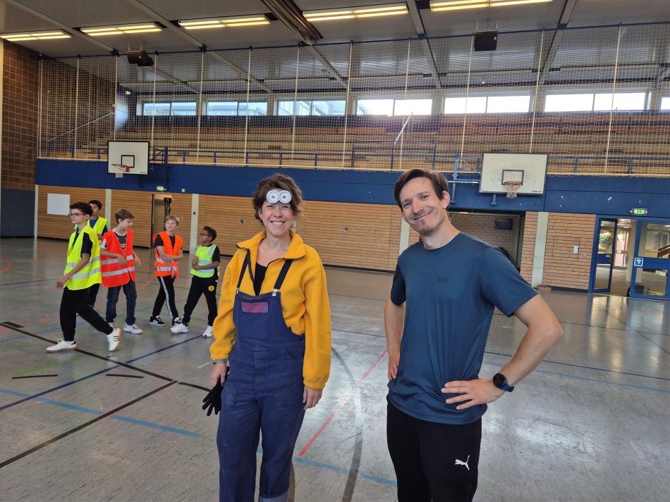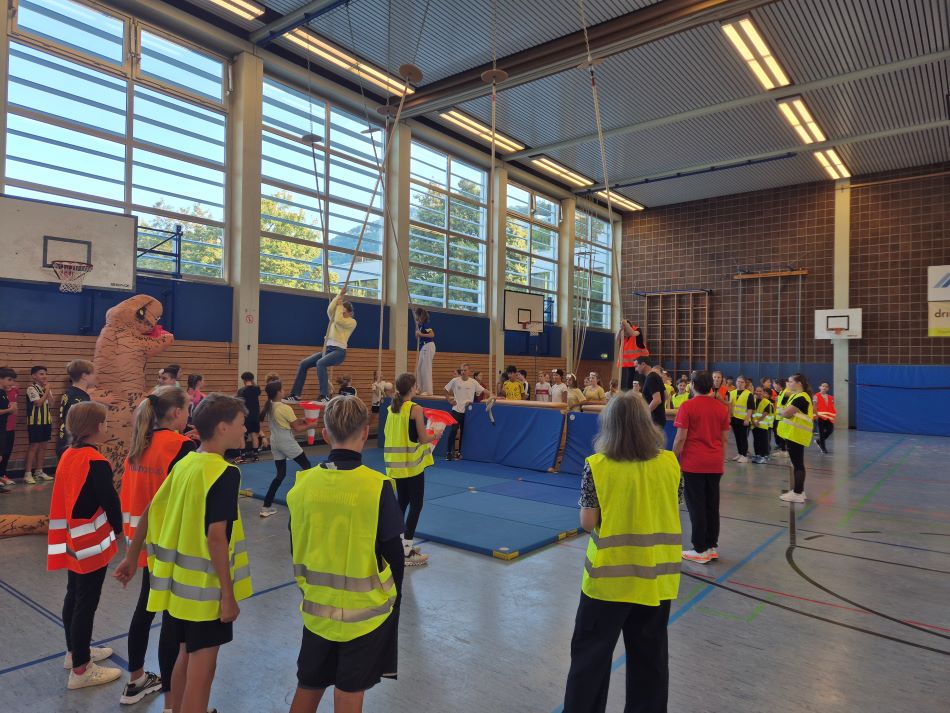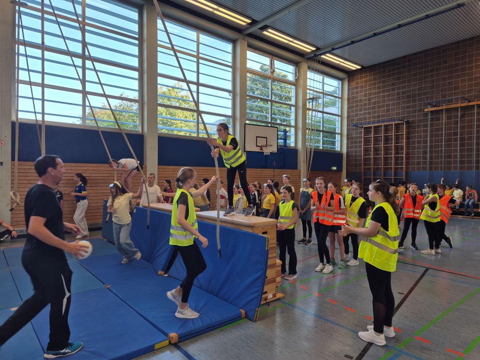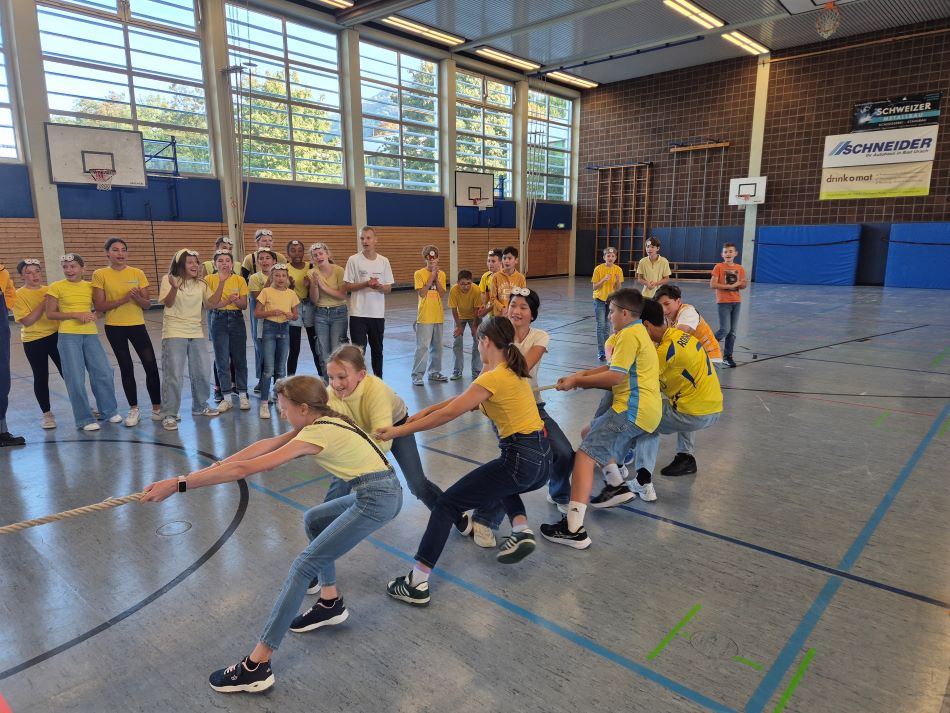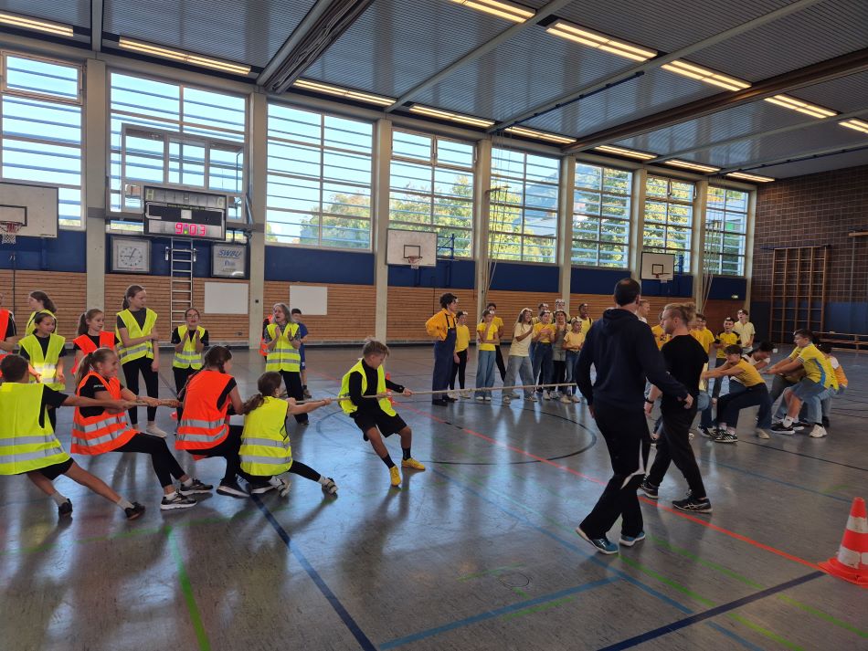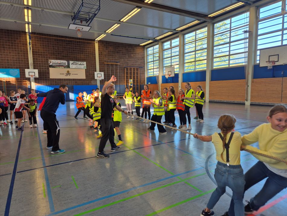 Nach dem Aufwärmen folgten die verschiedenen Spielrunden. Die Mannschaften maßen sich beispielsweise im Superjump (eine Art Dreisprung) oder beim „Full Power“. Beim „Push the egg“ musste ein Rugbyei um Hütchen gedribbelt werden und beim „Moonhopper“ galt es möglichst schnell auf einem Gymnastikball zu hüpfen. Den Höhepunkt des Sporttages bildete sicherlich die Kleiderstaffel am zum Abschluss des Turniers.