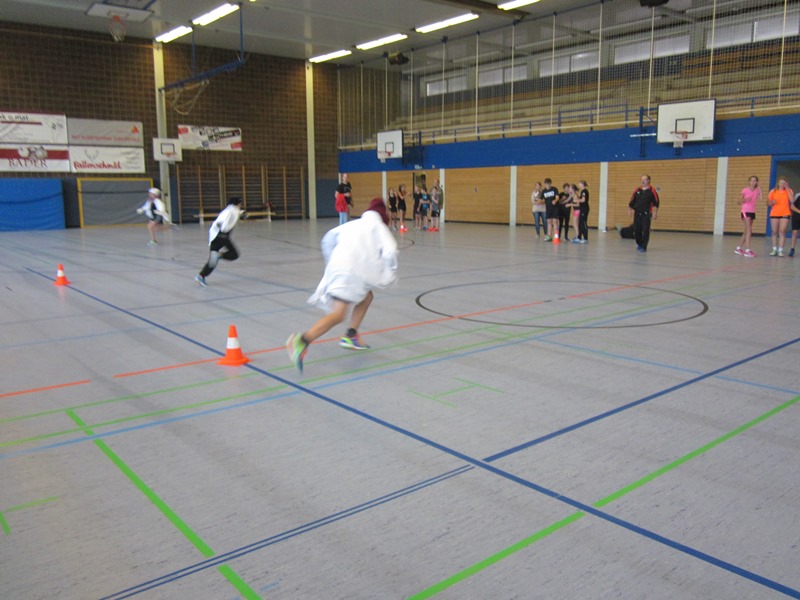 Wieder einmal fand der legendäre Sporttag der Klassenstufe 8 statt. Alle freuten sich schon Tage vorher darauf. Dann war es endlich soweit. Wir begrüßten uns mit coolen und individuellen Schlachtrufen wie: 8c goad ab wie Schnitzel! oder: Du bist Hipster, du bist Styler, du weißt doch selber, 8b ist geiler! Dann wärmten sich alle zusammen zur Musik auf. Selbst die Lehrer waren hoch motiviert. Dann gingen die witzigen und coolen Spiele los! Superjump war das erste Spiel, dabei musste jeder 3x so weit wie möglich springen. Mit meilenweitem Vorsprung gewann 8-Black (8b). Danach ging es rasant weiter mit dem nächsten Spiel. In der Tauzieharena gab jeder Teilnehmer sein Bestes. Bei push the egg musste ein Rugby-Ei gedribbelt werden. Darin waren die Fußballer sehr gut, obwohl es sehr schwer war den anderen nicht in die Quere zu kommen. Es machte allen Spaß, egal ob man gewann oder verlor. Es gab sogar Extrapunkte für tolle Plakate, Kleidung oder Schminke. Schüleraussagen zu dem Spiel Moon-Hopper (auf einem Petziball eine Strecke zurücklegen) war: „Es war schwer sich auf dem Ball zu halten, hat aber Spaß gemacht.“ Auch das Publikum fand es witzig und unterhaltsam. Es gab natürlich auch eine Pause. Hungrig stürzten sich alle aufs Buffet, zu dem viele etwas mitgebracht haben. Bei Kokosnusstransport sahen alle wie Äffchen an Lianen aus. Die Teilnehmer mussten den Ball mit den Füßen in ein Hütchen befördern. Die Stimmung war super. Dann war Seilspringen angesagt. Dabei hatten die Ropeskipper einen klaren Vorteil. Hier gewann die Klasse 8d. Das nächste Spiel war ein Eierlauf. 2 Schüler hatten zusammengebundene Füße und mussten einen Tischtennisball auf einem Löffel transportieren, da man nicht sagen konnte wer gewinnt gab es keinen Favoriten. Selbst der Schuldirektor Hr. Schlumberger schaute noch eine Weile zu. Es gab noch ein Special-Dart, bei dem verschiedene Gegenstände in einen Kasten geworfen wurden. Dies war nicht ganz einfach. Eine Schüleraussage war: Das war so cool! Ich hab getroffen. Das Elefantenspiel machte einige ziemlich schwindelig, da man um eine Stange rennen musste und anschließend um ein Hütchen. Manche torkelten, andere fielen sogar hin. Als das letzte Spiel beginnt wird es noch einmal spannend. Es ist eine Art Fußball mit Petziball, wobei der Körper aber nur von der Hüfte aufwärts benutzt werden darf. Alle wollen noch einmal siegen und Punkte sammeln. Zum Spaß gab es dann noch eine Kleiderstaffel. Hierbei gewannen die Lehrer, die bei diesem Spiel mitmachten. Die Endplätze waren: 4. Dream-C (8c) 3. A-Team (8a) 2. The Black (8d) 1. 8-black (8b) Der Preis für alle Klassen war eine Freistunde.