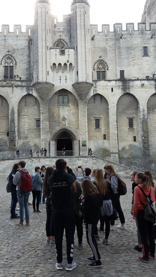Ausgeschlafen genug für eine dreistündige Stadtführung durch allerlei entlegene Gassen und Viertel waren wir eigentlich noch nicht, aber da mussten wir eben durch. Zugegebenermaßen konnte die Gruppe gleich allerlei Interessantes besichtigt. Hervorzuheben sind sicherlich der weltberühmte ,,Palais des Papes‘‘ (der Papstpalast- ein Weltkulturerbe des 14. Jahrhunderts, in dem einige Päpste und Gegenpäpste regierten), sondern auch die berühmte Brücke von Avignon an der Rhône, die auch im oben bereits genannten Lied besungen wird.