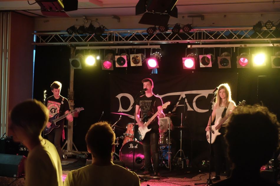 Nach einem Jahr Pause wurde eine altbewährte Tradition am Uracher Gymnasium wiederbelebt: Die Bandnight. Nachdem der Arbeitskreis Technik in einem Kraftakt den Lichthof der Schule in eine beeindruckende Rocklandschaft aus Lichtstrahlern und Lautsprechern verwandelt hatte, konnten die sechs Bands mit leichter Verspätung (wie sich das für große Konzerte gehört) die Besucher zum Schwitzen bringen. Den Anfang machte eine noch junge Band aus dem Proberaum unserer Schule: Voltage Strike (Bild). Und sie wurden ihrem Namen mehr als gerecht. Mit vielen erstklassig dargebotenen Coverhits der Rockgeschichte elektrisierten die vier Bandmitglieder gleich zu Beginn das Publikum. Der erste Song war Programm: „Blitzkrieg Bop“ von den Ramones steht wie kaum ein anderer Song für die Verschmelzung von Rock'n'roll und Punk. Die Zeile „Hey, ho, let's go!“ ist ein Meilenstein in der Musikgeschichte und gleichzeitig pure Lebensfreude. Wie einige der ganz großen Bands der Siebziger- bis Neunzigerjahre haben auch Voltage Strike eine Frau an der Bassgitarre. Damit stehen sie in einer Reihe mit den großen Sonic Youth, Melvins, Pixies und natürlich den Smashing Pumpkins. Die Gruppe, die nach dieser engagierten Debutband die Bühne erklomm, sorgte sicher für den größten stilistischen Bruch des Abends: Älternabend, ein kurzfristig für die Bandnight aus der Traufe gehobenes Musikprojekt dreier Lehrer des GEG. Sie orientierten sich am Sound der frühen Achzigerjahre, die bekannte Neue Deutsche Welle-Band Trio hat sie maßgeblich beeinflußt und sie überraschten die Schüler mit elektronischer DADA-Kunst. Danach wurde es wieder rockig. Double U D 40 und The Standards, zwei Band mit ehemaligen Schülern des GEG und beide mit Wurzeln in Hülben, präsentierten rockig-punkiges und stimmten so die Menge für den letzten Act des Abends ein. Double U D 40 sorgten mit drei Gitarren für ein ordentliches Soundbrett von der Bühne. The Standards bestachen auch durch ihre Songauswahl und durchbrachen die E-Gitarren-Rockschiene durch den funky Crossover der Red Hot Chili Peppers. Die letzte Band des Abends, die Gruppe DEFACE, fünf ehemalige GEGler, sind in der Region durchaus schon bekannt und sorgten für einen angemessenen Abschluss des Abends. Sowohl die kreativen Texte, als auch der „hart-launige“ Sound der Band sprachen das Publikum offensichtlich an und die Trompetenklänge hoben die Band wohltuend ab. Sie spielten neben älterem Material vor allem die Songs ihrer kürzlich erschienenen CD „Gemeinsam daneben“. Insgesamt ein sehr gelungener Neustart für die Uracher Bandnight und wir hoffen auf noch mehr begeisterte Gäste in den nächsten Jahren.
