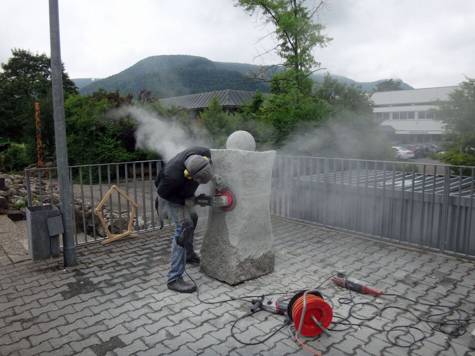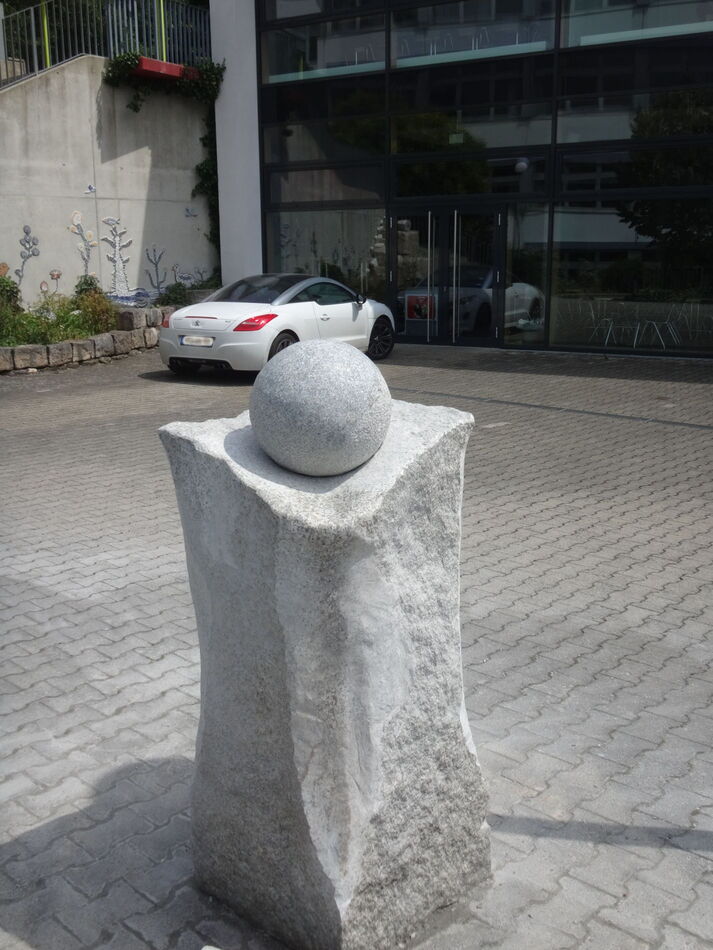 An Stelle des `Tempus fugit` mit der riesigen Uhr im Rücken rückt jetzt die verzwickte Situation des Korinther Königs Sisyphos in den Mittelpunkt des Betrachters. Die steinerne Kugel als Symbol für nie endende Mühe und Arbeit hängt auf abschüssigem Gipfel beängstigend nah am Abgrund, und das ewige Hinunterrollen mit anschließend kräftezehrendem Hinaufstemmen derselben hat im harten Granit bereits eine glänzend polierte Spur eingefräst.