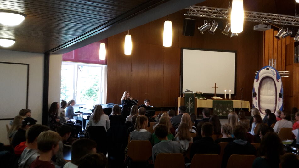 Schülerinnen und Schüler hatten diese Veranstaltung gemeinsam mit den Religionslehrern organisiert. Und so stimmten sich ca. 150 Besucher in der ersten Stunde nach den Sommerferien gemeinsam auf ein neues, spannendes Schuljahr ein. Die Gäste erwartete ein breites und abwechslungsreiches Programm: Besinnliche Töne, Psalmen und Gebete schärften den Blick für das Wesentliche des bevorstehenden Schulalltages und vermittelten Ruhe und Kraft. Die vielen musikalischen Einlagen luden aber auch zum Mitsingen ein und sorgten für die fröhlich-gelassene Stimmung, mit der man an ein neues Schuljahr herantreten sollte.