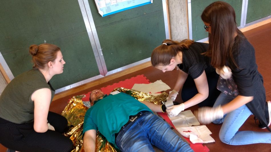 Am Vormittag hatten die Schüler des GEG die Möglichkeit ihr Können unter Beweis zu stellen. Dabei galt es vier nachgestellte Notfallsituationen zu bewältigen, welche von den Mitarbeitern des Roten Kreuzes sehr realistisch dargestellt wurden. Versorgt und betreut wurden verschiedene „Patienten“, wie beispielsweise ein Schüler mit scheinbarem Sonnenstich. Die Wunden und Blessuren einer Reinigungskraft, welche beim Fensterputzen von einer Leiter gestürzt war und einer Kunstlehrerin, die sich einen Nagel in den Fuß getreten hatte, wurden ebenso fachmännisch verbunden und behandelt. Dass der Schulsanitätsdienst nichts für schwache Nerven ist, wurde besonders bei der letzten Notfallsituation deutlich: Ein Hausmeister hatte sich mit dem Winkelschleifer den Daumen abgetrennt. Die Schulsanitäter des GEG reagierten professionell und besonnen. Sie stillten die starke Blutung mit einem Druckverband, versorgten das Amputat und betreuten den Hausmeister auch psychologisch bis zum Eintreffen des Notarztes.