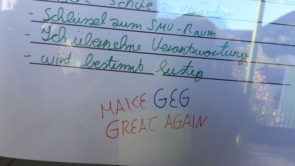 Beim SMV-Tag standen sicherlich zuerst die organisatorischen Punkte im Vordergrund, durch die Vorstellung des neuen Demokratieprojektes und der angedachten Renovierungsmaßnahmen am GEG wurde aber auch schon konkret inhaltlich gearbeitet. Vertreter der Schulklimagruppe erläuterten das ambitionierte Projekt „Gemeinsam Demokratie Gestalten“. Zudem lieferte die Versammlung eine große Menge an Vorschlägen und Anregungen, die Renovierung des GEG betreffend. Diese werden nun umgehend an die Schulleitung und die Baugruppe rückgemeldet. Das neue SMV-Jahr ist gestartet.