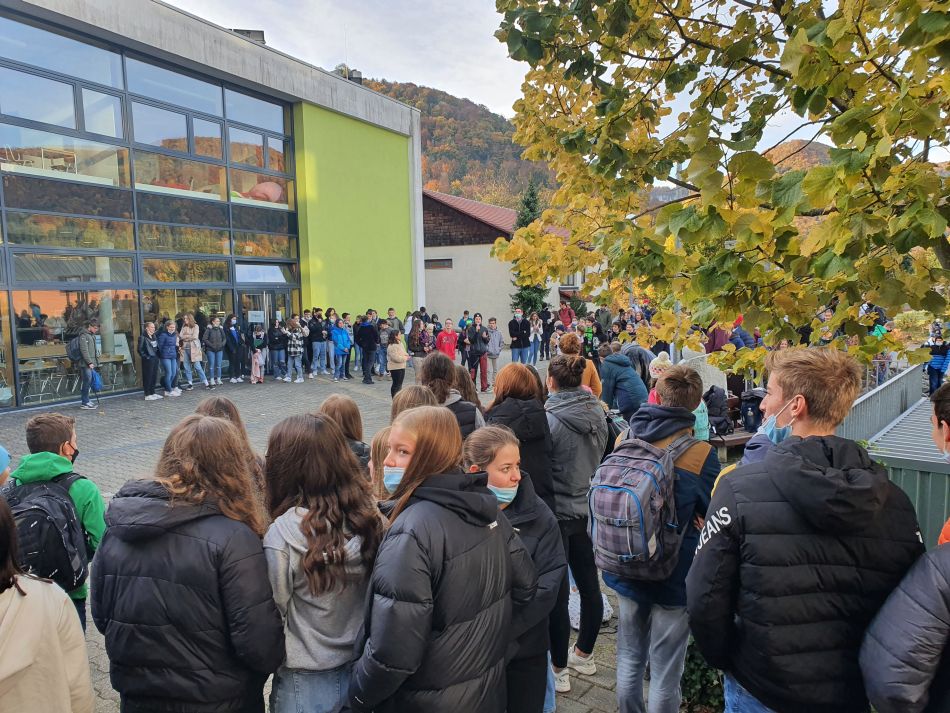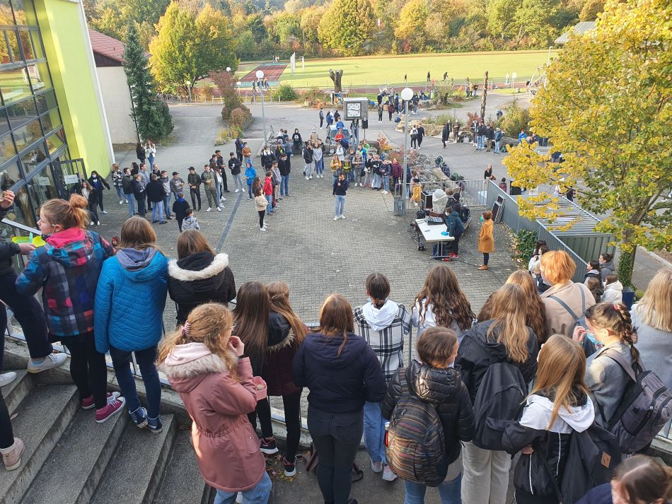 Doch dabei sollte es nicht bleiben. Auch die Gremien der SMV müssen neu besetzt werden und so begann in der vergangenen Woche der „Wahlkampf“ um das Amt der Schülersprecher. Diese werden in diesem Schuljahr erstmals direkt von allen Schülerinnen und Schülern gewählt werden und so sollten sich auch alle Kandidaten und Kandidatinnen öffentlich der Schulgemeinschaft vorstellen können. Zu unserer besonderen Freude hatten sich bereits 13 Kandidaten gefunden, die ihre Ideen und Ziele als Schülersprecher umsetzen wollen. In Anbetracht der zahlreichen Kandidaten und der großen Anzahl an Zuhörern verbot sich coronabedingt natürlich eine Präsentation in geschlossenen Räumen – doch die sich noch im Amt befindlichen Schülersprecher und Vertrauenslehrer ließen sich nicht beirren: Die Veranstaltung wurde kurzerhand in den Schulhof verlegt. Unterstützt von unserem hochprofessionellen AK-Technik wurde der Schulhof in der vergangenen Woche zweimal in eine „Freilicht-Wahlkampfarena“ verwandelt und alle Kandidaten konnten sich und ihr Programm der interessierten Schülerschaft vorstellen; so sieht gelebte Demokratie aus.