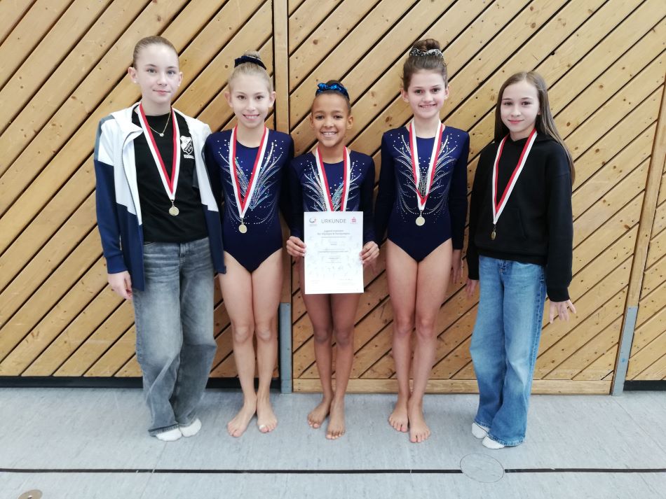 Patricia, Luisa, Lea, Ida und Marlene starten zum ersten Mal im Bundeswettbewerb U16 im Kürwettkampf und erkämpften sich, trotz eines unglücklichen Sturzes, durch hohe Schwierigkeitsgrade einen ersten Vorsprung. Diesen konnten unsere Mädels von Gerät zu Gerät festigen und sogar ausbauen. Am Ende stand ein deutlicher Sieg mit 12 Punkten Vorsprung vor den beiden Mannschaften vom FSG Pfullingen zu Buche.