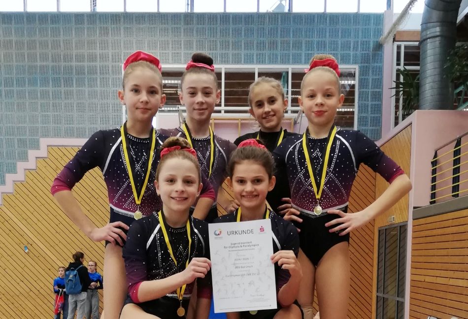 Am Vormittag startete der Pflichtwettkampf des U14-Damenteams, die bereits im letzten Jahr den Landesmeistertitel errungen hatten. Ihren ersten Wettkampf für das GEG absolvierte dabei Joleen Seidel aus der fünften Klasse. Bei ihrem Debut konnte sie voll überzeugen und auch der Rest des Teams erturnte durchweg hohe Wertungen. Dieser starke Auftritt wurde letztlich mit dem erneuten Gesamtsieg belohnt.