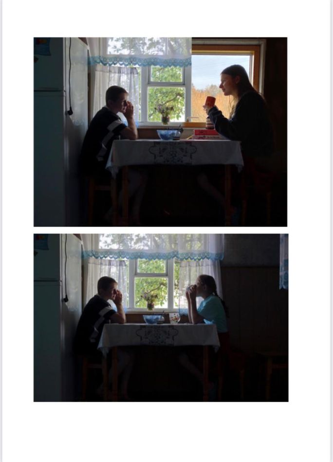 Inspiriert von ihrer Schwester, die vor einigen selbst an diesem Wettbewerb teilgenommen hatte, wandte sich die Zehntklässlerin Fidelia Dax der diesjährigen Aufgabe zu. Es galt eine Aufnahme der bekannten ukrainischen Fotografin Oksana Kyzymchuk, die vor allem Familienszenen porträtiert, selbstständig und vergleichend zu interpretieren. Fidelia entschied sich, die dargestellte Szene nur teilweise zu erhalten und ein Selbstporträt in die nun vorliegende Freifläche zu retuschieren. Auf diese Weise sollte ein bildlicher Dialog zwischen den dargestellten Personen und damit im übertragenen Sinne auch ein Dialog der deutschen und der ukrainischen Kultur entstehen, der unter den derzeitigen Coronabedingungen so kaum zu realisieren wäre. Die junge Künstlerin selbst beschreibt ihre Intention wie folgt: „Durch die Fotomontage konnte ich den Raum betreten und den Platz der ursprünglich dargestellten jungen Frau einnehmen. So konnte ich in den Dialog treten und erfahren, was dieser Junge wohl denkt. In diesem Bild kann ich nun tun, was ich am liebsten mache: Reden, dem Gegenüber Fragen stellen, Gefühle und Gedanken austauschen.“