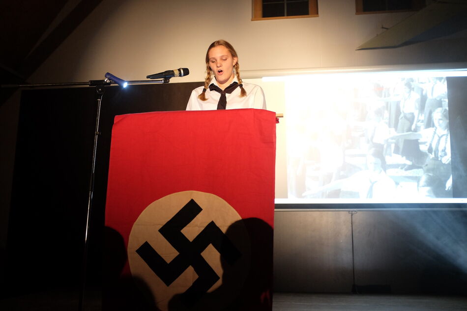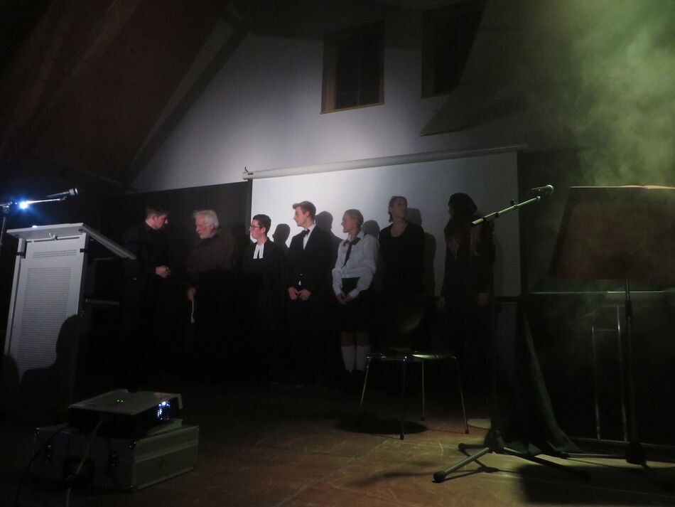 Schüler, als Vertreter verschiedenster Epochen, präsentierten ihre Sicht auf Eberhard, was dann jeweils im Anschluss von dem aus dem Todesschlaf erwachten Grafen (Kurt Keifenheim) kritisch kommentiert wurde. Auf diese Weise wurde klar, dass historische Personen von den nachfolgenden Generationen für eigene politische oder religiöse Zwecke benutzt, teilweise auch missbraucht werden. Geschichte ist eben immer nur Konstrukt und kann nicht mit der tatsächlichen Vergangenheit gleichgesetzt werden.