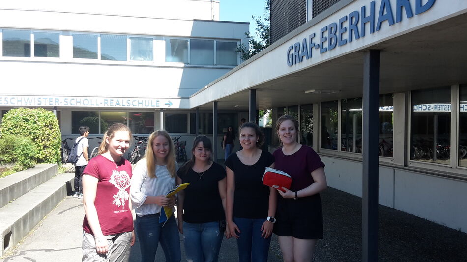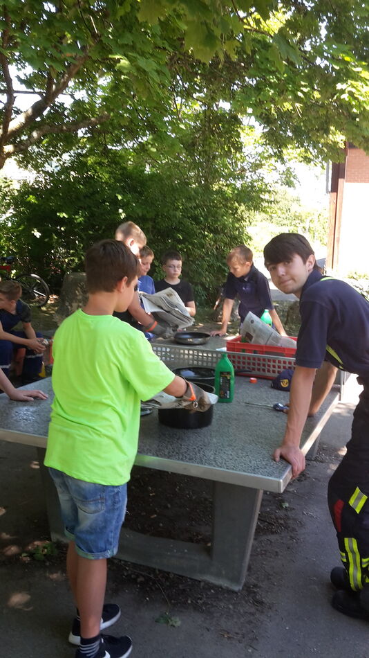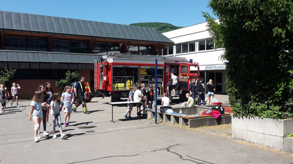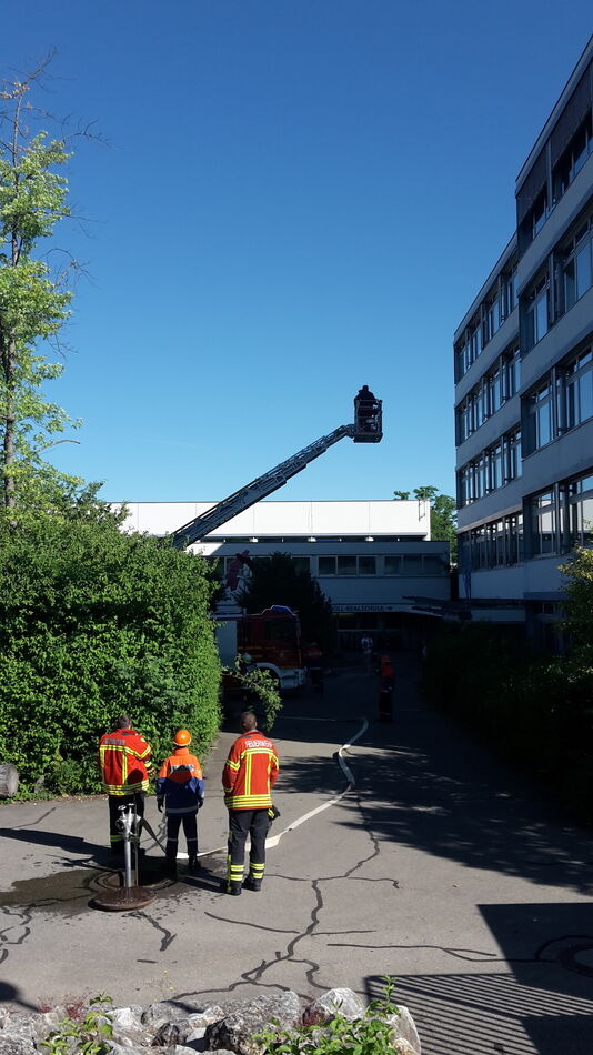 Mit mehreren Einsatzfahrzeugen erreichten diese wenige Minuten nachdem der Alarm ausgelöst worden war den Schulhof des Gymnasiums. In Windeseile waren die Feuerwehrleute, tatkräftig unterstützt von Helfern der Jugendfeuerwehr, einsatzfertig. Sogar die große Drehleiter wurde in Stellung gebracht, um Josef Stehle, den Sicherheitsbeauftragten der Schule, aus dem vierten Stock zu „retten“. Im Anschluss an die insgesamt sehr gut und diszipliniert absolvierte Übung organisierte die Feuerwehr verschiedene Workshops für die Fünftklässler der Schule. In kleinen Gruppen wurden unterschiedliche Szenarien und Übungen durchgespielt. So übte man den Umgang mit Feuerlöschern oder die Reaktion auf Kleinbrände im häuslichen Umfeld.