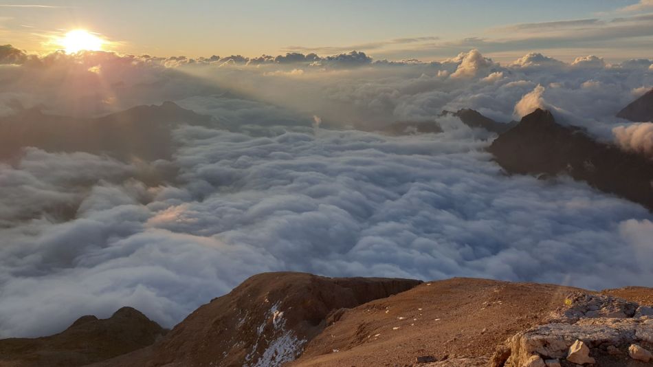 Am dritten Tag ging es dann hinauf auf den Piz Boe, welcher auf 3152 m liegt. Nach einem zweifellos anstrengenden und langen Anstieg wurden alle mit einem der schönsten Blicke der Tour, über zahlreiche Gipfel der Dolomiten hinweg, entschädigt. Bevor dann am Donnerstag wieder der Abstieg vom 3000er erfolgte, war es nochmals möglich die aufgehende Sonne und eine Wolkenschicht im Tal, aus welcher nur noch Gipfel hervorstachen, zu bewundern. Dieser Blick dürfte sich Wohl in das Gedächtnis von jedem Teilnehmer der Studienfahrt eingebrannt haben. Die nachfolgenden Stunden wurden dann mit einem Abstieg ins Tal und mit einem kleineren Aufstieg zur letzten Hütte verbracht. Am letzten Tag ging es dann noch über einen Pass zum Zielort St. Johann, in welchem dann wieder der Bus bestiegen wurde. Bevor jedoch der Abstieg vom Pass begonnen wurde, wartete auf den der konnte und Lust darauf hatte noch ein echtes Highlight. Es gab die Möglichkeit, weitere 400 Höhenmeter über einen Klettersteig nach oben zu gehen und damit den Gipfel des Sass Rigais zu erklimmen. Von diesem 3025 Meter hohen Gipfel bot sich einer der schönsten Blicke der Tour. Zudem war es möglich, nicht nur ins Tal und weit über die Gipfel Südtirols zu blicken, sondern auch nochmals alle markanten Punkte und Gipfel der Tour zu sehen. Dies war ohne Frage ein absolutes Highlight zum Schluss der Tour.