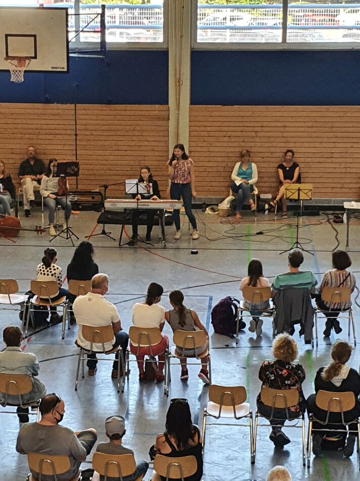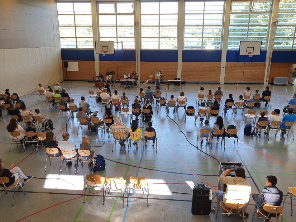Dennoch sind wir uns sicher, dass wir als Schulfamilie schon bald eine Heimat für unsere jüngsten Zuwächse sein werden. Deswegen wollten wir es uns trotz Corona und der wichtigen Vorsorgeregeln nicht nehmen lassen, auch den diesjährigen Fünfern einen würdigen Einstieg zu bereiten. Begrüßt wurden die Klassen nacheinander, um die notwendigen Abstände einhalten zu können, in der Ermstalhalle. Aufregung, Vorfreude, vielleicht auch ein wenig Anspannung lag in der Luft, als sich gegen acht Uhr die ersten Schüler gemeinsam mit den begleitenden Eltern in der Halle verteilten. Die anderen beiden Klassen folgten dann immer eine Stunde zeitversetzt.