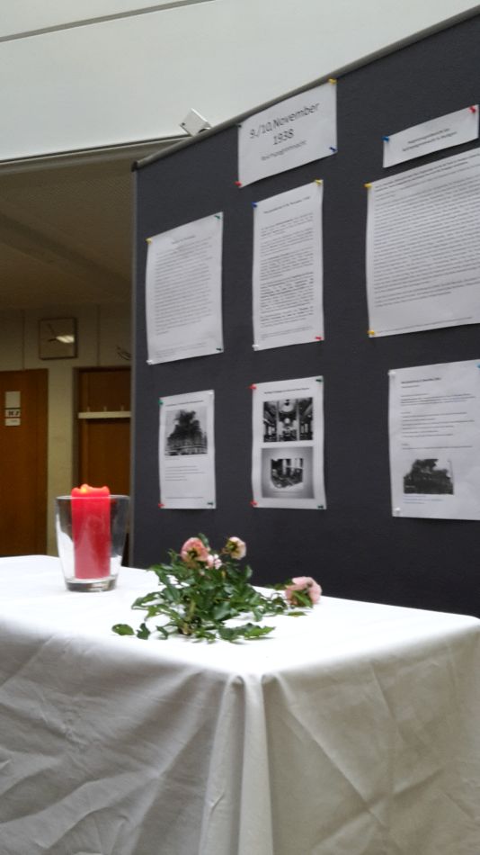 Wer am Freitagmorgen das GEG betrat wurde unweigerlich auf unterschiedliche Plakate aufmerksam, die an allen Eingängen der Schule aufgehängt worden waren: „Heute vor 80 Jahren brannten in Deutschland 1400 Gotteshäuser – Die Feuerwehr löschte aber nicht. Warum?“ oder auch „30 000 Deutsche wurden an diesem Tag verhaftet – Waren es die Brandstifter?“. Diese und andere Aussagen sollten die Schülerinnen und Schüler in eine fragende Grundstimmung versetzen. Einige konnten natürlich schon Bezüge herstellen, andere, insbesondere die jüngeren Schüler, blieben erst einmal rätselnd zurück. Das jeweils letzte der angebrachten Plakate verwies dann schließlich auf den Lichthof. Dort war eine Informationswand aufgebaut worden, auf der die grundlegenden Fakten zur Reichspogromnacht, Berichte und Bilder über diverse Attacken auf Synagogen der Region und die berühmte Rede Richard von Weizäckers zum Kriegsende präsentiert wurden. Umrahmt war dieser Ort der Information mit einem weiß gedeckten Tisch, auf dem lediglich ein Strauß wilder Rosen und eine brennende Kerze standen. Diesen Teil des Gedenktages hatten Wolfgang Scherer und Michael Jaesrich zusammen mit Neuntklässlern entworfen und den ganzen Tag über konnte man beobachten wie gut diese Form des Erinnerns angenommen wurde. Immer wieder sammelten sich kleine Gruppen von Schüler oder Lehrern vor dem Tisch, innehaltend vor den verstörenden Bildern oder vertieft in die Lektüre der dargebotenen Texte.