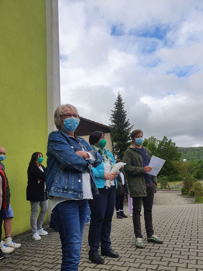 Punkt neun Uhr ertönten die Fanfaren (genauer gesagt Posaunen) im Schulhof des GEG und alle anwesenden Schüler und Lehrkräfte strömten vor das Schulhaus, von wo aus man die in großen Lettern prangende Losung des Tages in den Fenstern des Lehrerzimmers sehen konnte: „Danke Frau Ostertag“.