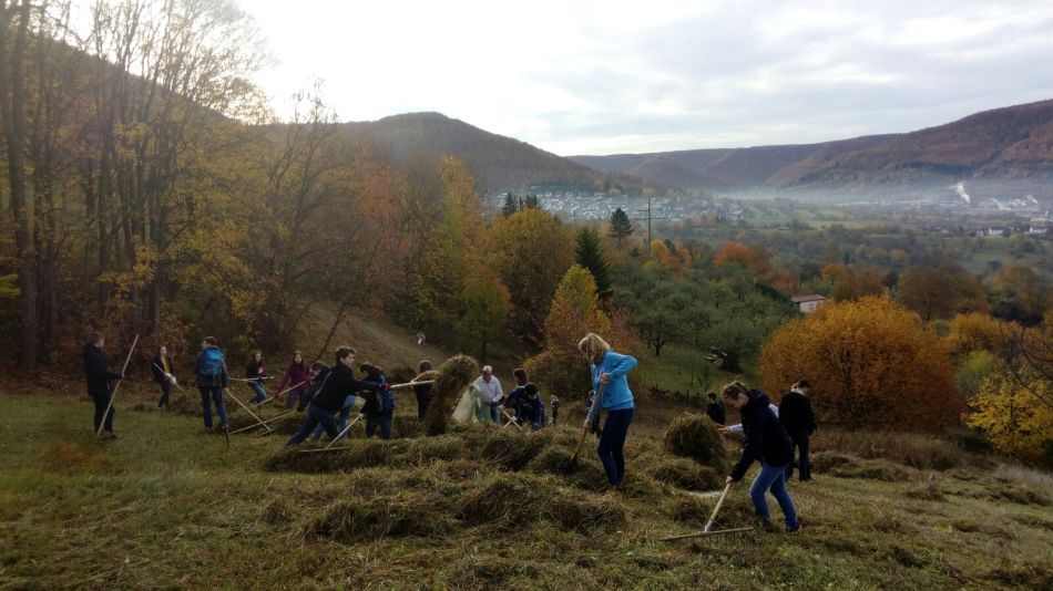 Gegen acht Uhr hatten sich die Schülerinnen und Schüler zweier zehnter Klassen des GEG mit ihrem Lehrer Michael Jaesrich am Treffpunkt nahe des Gaisbuckels versammelt und wurden von den Mitgliedern der Naturschutzgruppe des Schwäbischen Albvereins Dettingen begrüßt. Stefan Anhorn und der ehemalige GEG-Kollege Roland Schaich erklärten den Schülern worum es heute gehen sollte: Ziel des Tages war es große Wiesenflächen abzurechen und so vom gemähten Grüngut zu befreien. Dies dient dem Erhalt so genannter Magerwiesen, also relativ nährstoffarmer Wiesenflächen. Doch was hat dies mit Naturschutz zu tun? Die Magerrasenbiotope, typisch für die sonnengefluteten Hänge der Schwäbischen Alb, zeichnen sich durch eine ganz besondere und vielfältige Flora und Fauna aus. Im Gegensatz zu den intensiv durch Landwirtschaft genutzten Rasenflächen, so genannte Fettwiesen, bieten die nun gepflegten Grünflächen besonderen Pflanzen Lebensraum, die sich auch bei den erschwerten Bedingungen der Magerwiese durchsetzen können. In der Folge finden sich dann auch viele hochspezialisierte Insekten in diesem Biotop. Ganz besonders hervorzuheben sind wilde Orchideenarten, vor allem Knabenkraut- und Ragwurzarten, die an diesem Standort seit Jahren zu finden sind. Einige dieser Arten zeichnen sich durch ein ganz besonderes Fortpflanzungsverhalten aus, denn sie imitieren mit ihren Blüten Weibchen unterschiedlicher Insekten oder Spinnen, um deren Männchen zum Anflug und damit zur unfreiwilligen Bestäubung zu verleiten.