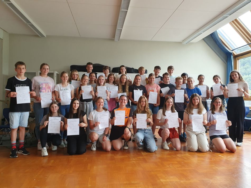 Ganz herzlich gratuliert werden soll an dieser Stelle auch noch den 35 Teilnehmern der Delf-AG (Diplôme d’études de langue francaise). Die Schülerinnen und Schüler haben innerhalb der AG ein Jahr lang hart gearbeitet und zum Abschluss ihre Französischkenntnisse in einer Prüfung unter Beweis gestellt. Alle Teilnehmer haben bestanden und so dürfen sich nun 27 Schüler über das Diplom des A1 Niveaus, drei Schüler über das Diplom des Niveaus A2 und fünf Schüler über das Diplom des Niveaus B1 freuen. Die Diplome wurden noch vor den Ferien in einer kleinen Zeremonie von unserer Schulleiterin Susanne Müller überreicht. Sie zeigte sich dabei sehr angetan, über das große sprachliche Talent an unserer Schule. AG-Leiterin Ilse Beck, deren unermüdlichem Engagement diese Leistungen erst zu verdanken sind, betonte zudem, dass „das Ende der Fahnenstange noch nicht erreicht sei und alle Teilnehmer im nächsten Jahr eine weitere Niveausteigerung erreichen können.“ Musikalisch umrahmt wurde die Verleihung von Leonie Weber am Klavier. Ihr sei an dieser Stelle unser besonderer Dank ausgesprochen.