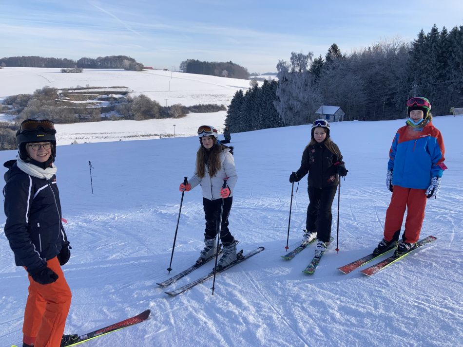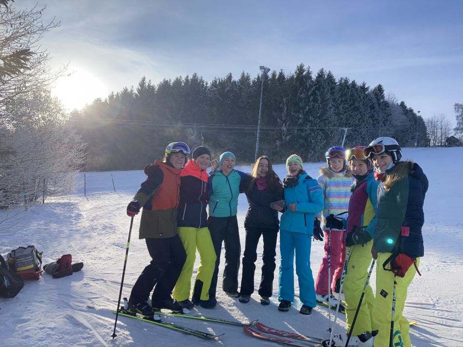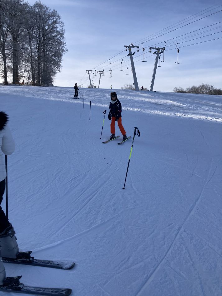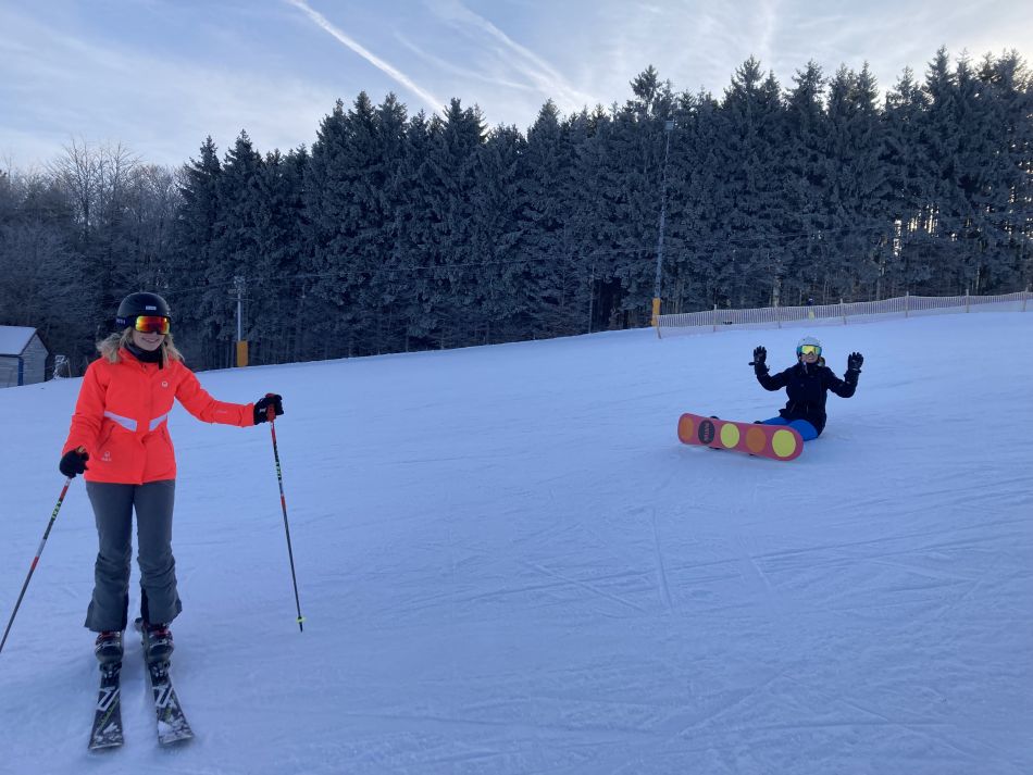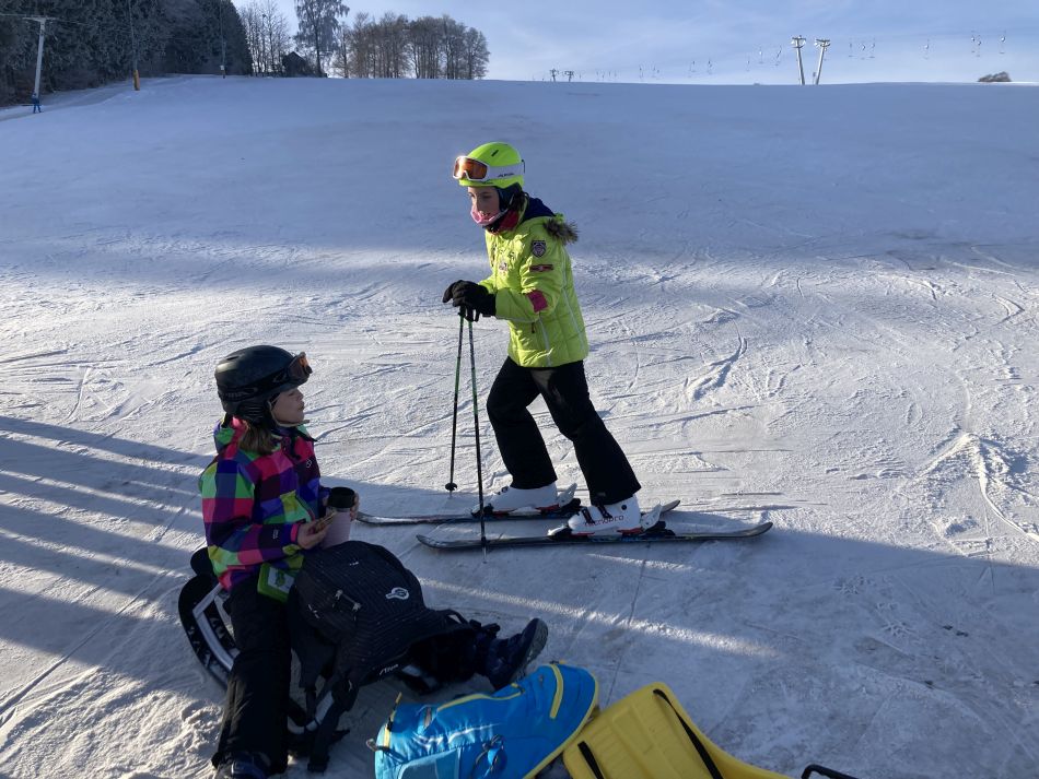 Frau Holle meinte es dann auch gut mit dem sowieso schon arg gebeutelten Organisatoren. Am Donnerstag den 27. Januar erstrahlte die schneebedeckte Alb in glänzendem Sonnenlicht und bot den angereisten Siebtklässlern und den sie begleitenden Lehrkräften beste Schneesportbedingungen. Von 9 Uhr bis in den Mittag hinein sah man die Schülerinnen und Schüler mit mit freudigen und von Anstrengung und kalter Luft geröteten Gesichtern am Skilift im Salzwinkel skifahren, am Nebenhang rodeln und im Hesel langlaufen. Über Schanzen wurde gesprungen, durch einen mit Skistöcken selbst gesteckten Lauf sowie durch den „Feenwald“ und den kleinen Funpark wurde in (zum Glück nicht) halsbrecherischer Art und Weise abgefahren. Den Skilift hatte das GEG ganz für sich allein und die Schüler konnten entsprechend ohne Wartezeit Runde um Runde drehen. Manche Schüler waren nicht zu stoppen und würden wahrscheinlich jetzt noch fahren, wäre der Lift nicht nach drei Stunden abgestellt worden.