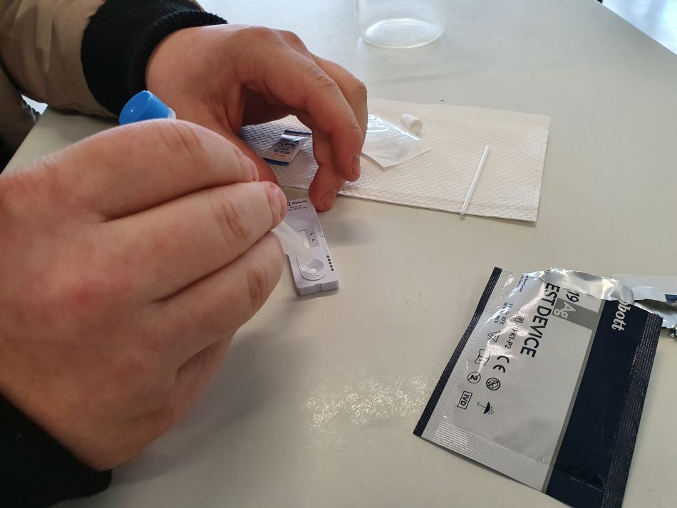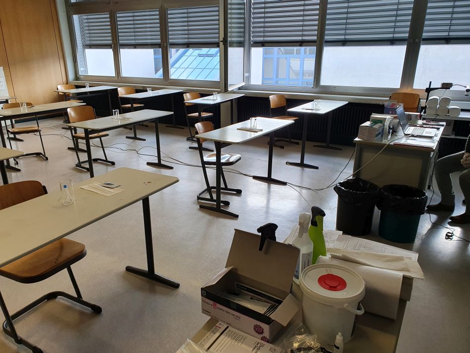 In zwei extra eingerichteten Testräumen bestand dann bereits vor den Osterferien die Möglichkeit, alle anwesenden Schüler zweimal die Woche testen zu lassen. Inzwischen haben wir reichhaltige Erfahrungen gesammelt, Abläufe verbessert und zunehmend verkürzt, so dass sich die Tests in Klassenstärke ohne nennenswerte Störung des Unterrichtsgeschehens bewerkstelligen lassen.