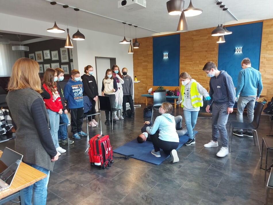 Unter Anleitung der beiden Begleitlehrer Meike Storbeck und Julian Aißlinger fand die Gruppe durch gemeinsame Spiele und Kletterübungen erst einmal zusammen denn gerade für Ersthelfer ist ein guter Teamgeist und effektive Zusammenarbeit unerlässlich. Im weiteren Verlauf des Workshops wurden die unterschiedlichen Grundlagen der Ersten-Hilfe Schritt für Schritt erarbeitet und durch diverse Übungen gefestigt. Die hochmotivierten Teilnehmer belohnten sich zum Abschluss der zwei intensiven Tage und erhielten für ihre Bemühungen eine offizielle Erste-Hilfe-Bescheinigung. Funkübungen rundeten den praktischen Teil ab. Darüber hinaus wurde noch der organisatorische Rahmen der Schulsani-AG für das kommende Schuljahr abgesteckt. So wurden Einsatzpläne erstellt und Gruppen gebildet, die im Notfall schnell agieren können.