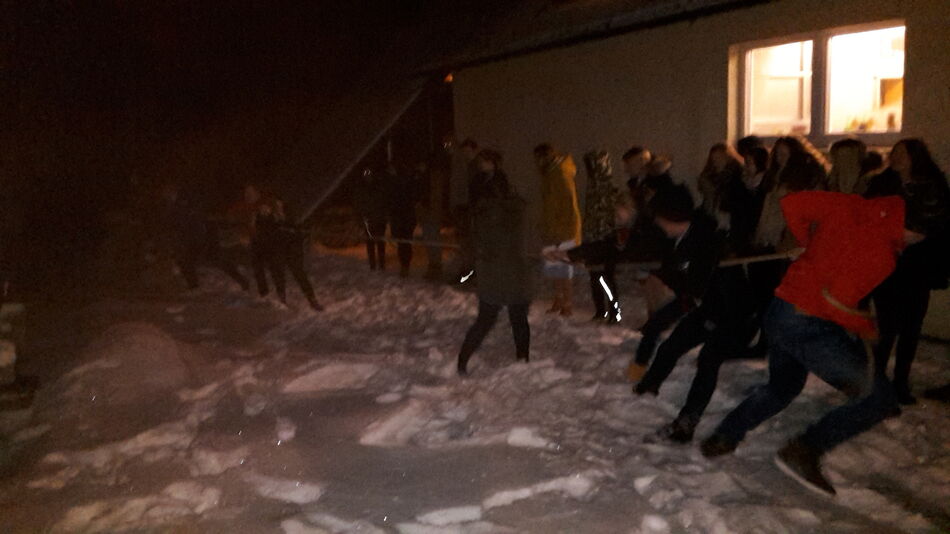 Neben vielen intensiven Arbeitssitzungen und Diskussionsrunden im Plenum sollte aber auch das gruppenbildende Moment nicht zu kurz kommen. Schneewanderungen auf der herrlich eingeschneiten Albhochfläche, der boarischer Abend und ein Musikvideodreh forderten Teamgeist und brachten großen Spaß.