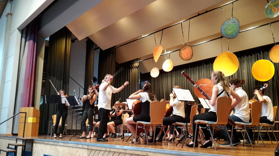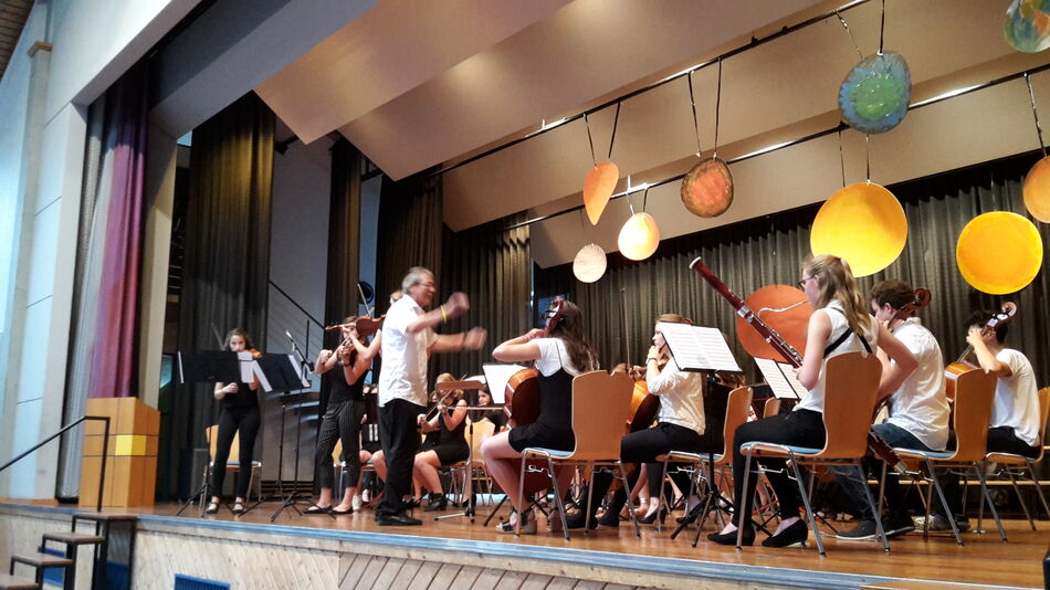 Instrumental ging es weiter. Das große Orchester der Schule betrat die Bühne und bewies wieder Mal seine grandiosen Fähigkeiten. Bekannte Themen des Filmmonuments „STAR WARS“ ließen Zuhörer aller Altersklassen in Erinnerungen an vergangene Kinoabende schwelgen. Den Höhepunkt dieses Programmteiles stellte sicherlich die von Sigrid Kasparian extra arrangierte Darbietung eines ungarischen Csardas von Michael McLean dar. Sophia Rapp, Debora Kasparian und Laura Baldszus sandten das Publikum mit ihrem furiosen Violinenspiel, dirigiert von Joachim Teufel, direkt in die Weiten der Puszta.