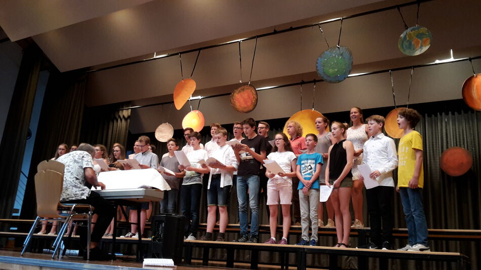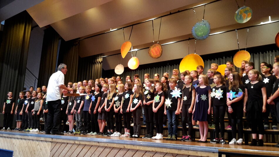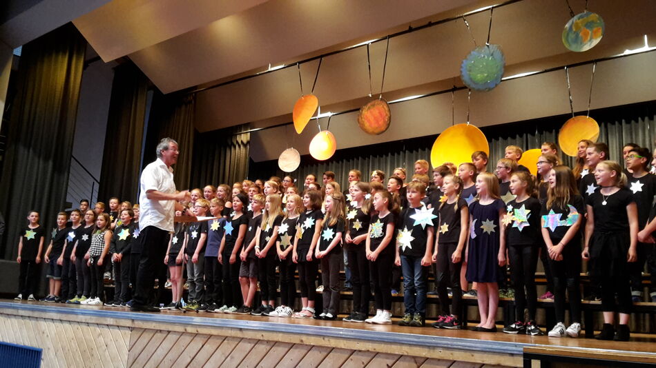 Während das Publikum noch über die Texte der Dylan-Songs grübelte, eroberten sich die 85 jüngsten Nachwuchssänger des Gymnasiums die Bühne. Der Chor der fünften Klassen nahm Aufstellung. Die jungen Sänger, angeleitet von Joachim Teufel, entführten ihr Publikum in den folgenden Minuten in die unendlichen Weiten des Alls. Umrahmt und rhetorisch geführt von den Texten Mathias Eicks, brachten die Fünftklässler die aufregende Geschichte eines wildgewordenen Schwarzen Loches zu Gehör. Planeten, Sterne und Kometen mussten musikalisch bemüht werden, um die Bedrohung der jungen „Stern-Sänger“ durch das Schwarze Loch endgültig abzuwenden.