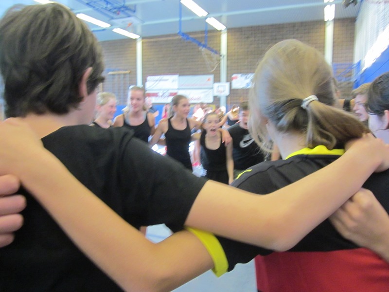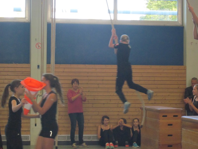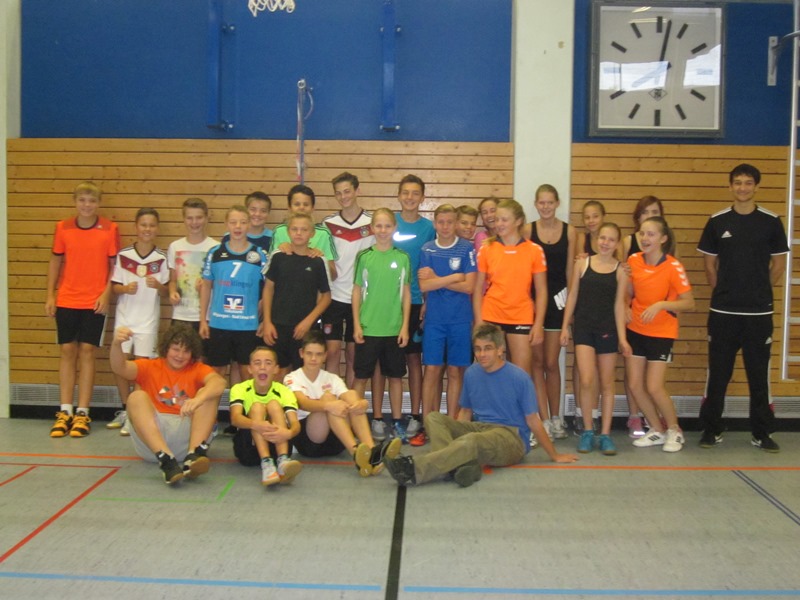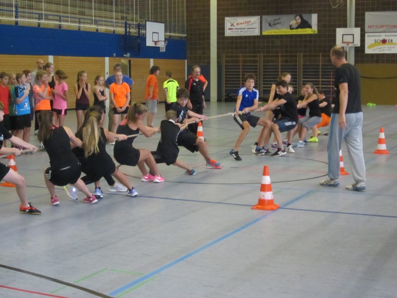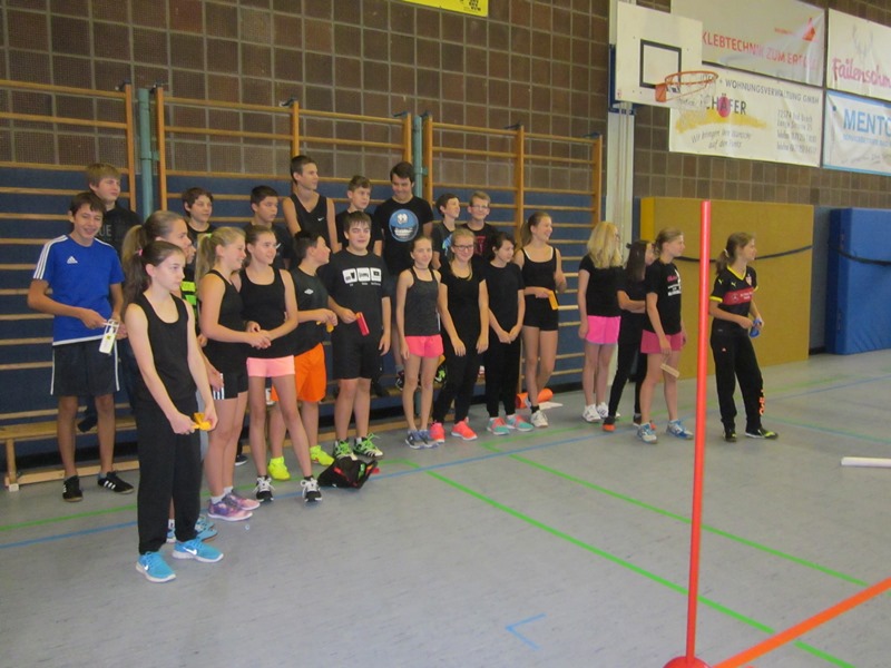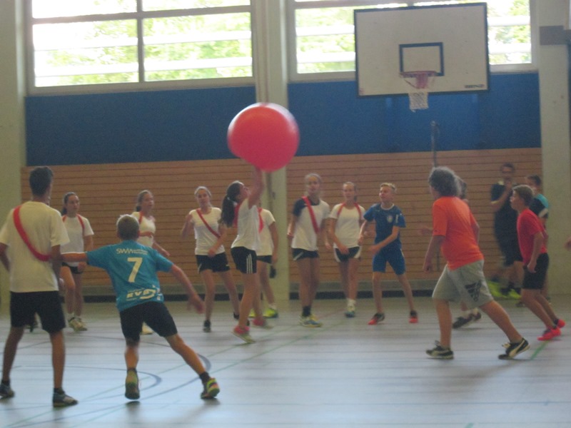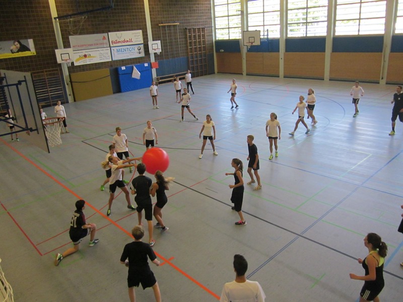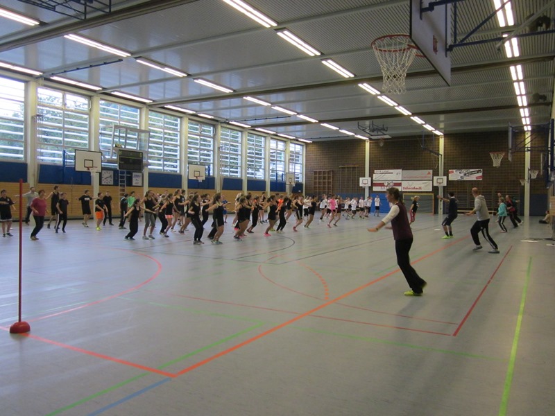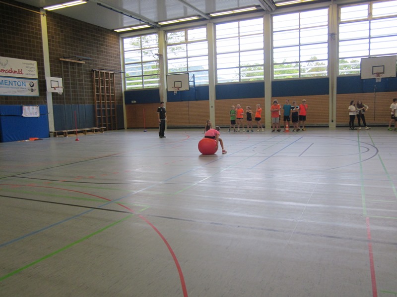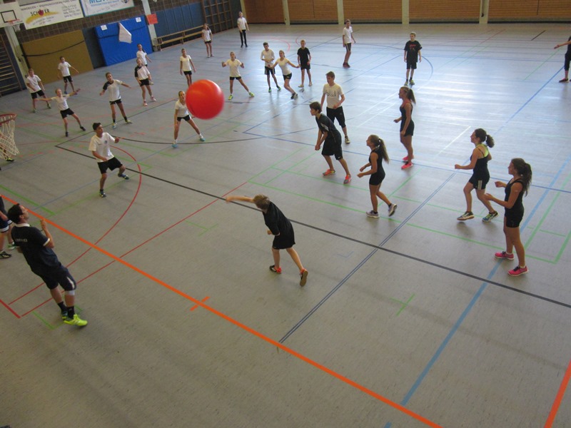 Wieder einmal fand der legendäre Sporttag der Klassenstufe 8 statt. Alle freuten sich schon Tage vorher darauf. Dann war es endlich soweit. Wir begrüßten uns mit coolen und individuellen Schlachtrufen wie: 8c goad ab wie Schnitzel! oder: Du bist Hipster, du bist Styler, du weißt doch selber, 8b ist geiler! Dann wärmten sich alle zusammen zur Musik auf. Selbst die Lehrer waren hoch motiviert. Dann gingen die witzigen und coolen Spiele los! Superjump war das erste Spiel, dabei musste jeder 3x so weit wie möglich springen. Mit meilenweitem Vorsprung gewann 8-Black (8b). Danach ging es rasant weiter mit dem nächsten Spiel. In der Tauzieharena gab jeder Teilnehmer sein Bestes. Bei push the egg musste ein Rugby-Ei gedribbelt werden. Darin waren die Fußballer sehr gut, obwohl es sehr schwer war den anderen nicht in die Quere zu kommen. Es machte allen Spaß, egal ob man gewann oder verlor. Es gab sogar Extrapunkte für tolle Plakate, Kleidung oder Schminke. Schüleraussagen zu dem Spiel Moon-Hopper (auf einem Petziball eine Strecke zurücklegen) war: „Es war schwer sich auf dem Ball zu halten, hat aber Spaß gemacht.“ Auch das Publikum fand es witzig und unterhaltsam. Es gab natürlich auch eine Pause. Hungrig stürzten sich alle aufs Buffet, zu dem viele etwas mitgebracht haben. Bei Kokosnusstransport sahen alle wie Äffchen an Lianen aus. Die Teilnehmer mussten den Ball mit den Füßen in ein Hütchen befördern. Die Stimmung war super. Dann war Seilspringen angesagt. Dabei hatten die Ropeskipper einen klaren Vorteil. Hier gewann die Klasse 8d. Das nächste Spiel war ein Eierlauf. 2 Schüler hatten zusammengebundene Füße und mussten einen Tischtennisball auf einem Löffel transportieren, da man nicht sagen konnte wer gewinnt gab es keinen Favoriten. Selbst der Schuldirektor Hr. Schlumberger schaute noch eine Weile zu. Es gab noch ein Special-Dart, bei dem verschiedene Gegenstände in einen Kasten geworfen wurden. Dies war nicht ganz einfach. Eine Schüleraussage war: Das war so cool! Ich hab getroffen. Das Elefantenspiel machte einige ziemlich schwindelig, da man um eine Stange rennen musste und anschließend um ein Hütchen. Manche torkelten, andere fielen sogar hin. Als das letzte Spiel beginnt wird es noch einmal spannend. Es ist eine Art Fußball mit Petziball, wobei der Körper aber nur von der Hüfte aufwärts benutzt werden darf. Alle wollen noch einmal siegen und Punkte sammeln. Zum Spaß gab es dann noch eine Kleiderstaffel. Hierbei gewannen die Lehrer, die bei diesem Spiel mitmachten. Die Endplätze waren: 4. Dream-C (8c) 3. A-Team (8a) 2. The Black (8d) 1. 8-black (8b) Der Preis für alle Klassen war eine Freistunde.