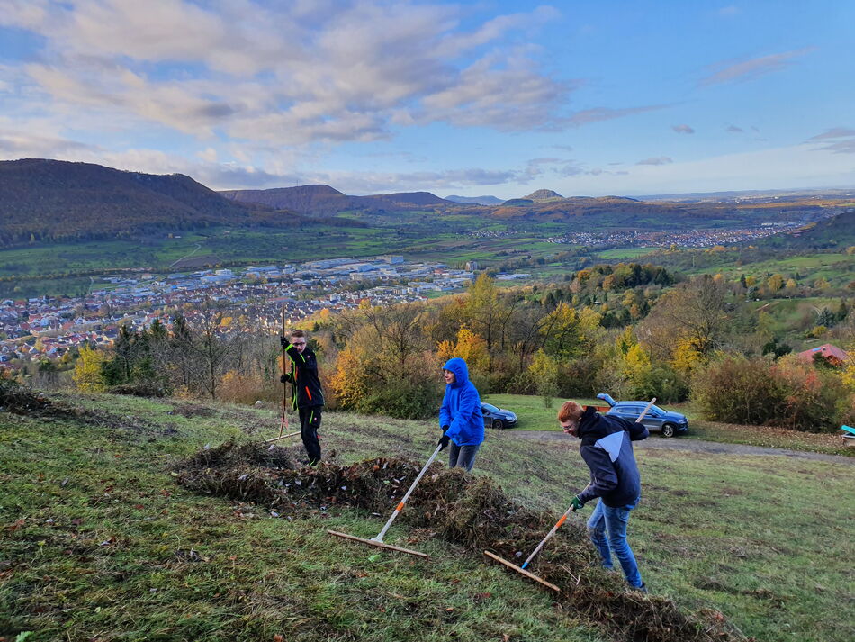 Michael Jaesrich, Lehrer am Graf-Eberhard-Gymnasium, war mit zwei zehnten Klassen zur Sammelstelle nahe des Gaisbuckels gekommen, um den Albverein Dettingen (Sektion Naturschutz) bei seiner herbstlichen Pflegeaktion am Sommerberg zu unterstützen. Die Aktion wurde koordiniert von Roland Schaich, der die Schüler am Treffpunkt begrüßte und das weitere Vorgehen erklärte. In Gruppen, jeweils geführt von erfahrenen und naturkundigen Mitgliedern des Albvereins, machte man sich auf zu den diversen Flächen und begann mit den Pflegearbeiten.