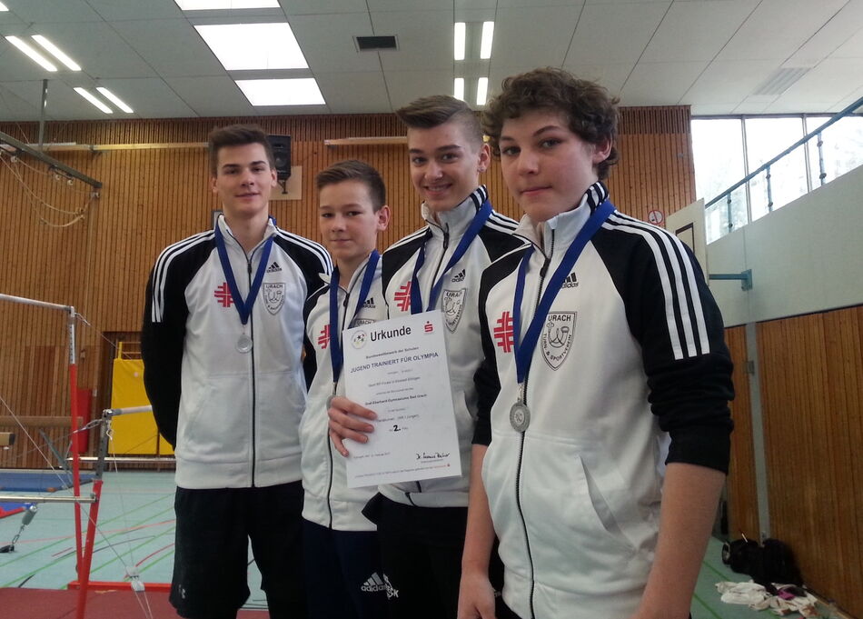 Ebenfalls freuen wir uns über die diesjährige Leistung der Jungenmannschaft des GEG. Aaron Göbel, Lukas Rau, Manuel Gaßner und Noah Holl traten dieses Jahr im WK I an. Auch wenn die starke Konkurrenz aus Markdorf beim RP-Finale nicht zu schlagen war, zogen die Jungs ihre Übungen konzentriert durch und zeigten durchweg Kampfgeist, wodurch sie sich einen tollen zweiten Platz erturnten.