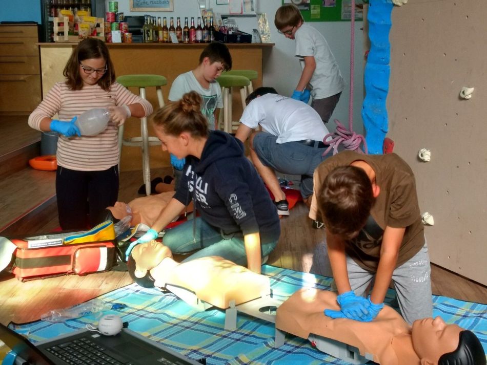 Unter Anleitung der beiden Begleitlehrer Gerti Redinger und Julian Aißlinger fand die Gruppe durch gemeinsame Spiele und Kletterübungen erst einmal zusammen. Gerade für Ersthelfer ist ein guter Teamgeist und effektive Zusammenarbeit unerlässlich. Im weiteren Verlauf der beiden Workshoptage wurden die Grundlagen der Ersten-Hilfe Schritt für Schritt erarbeitet und durch diverse Übungen gefestigt. Die hochmotivierten Teilnehmer belohnten sich zum Abschluss der zwei intensiven Tage und erhielten für ihre Bemühungen eine offizielle Erste-Hilfe-Bescheinigung. Funkerübungen rundeten den praktischen Teil ab. Darüber hinaus wurde noch der organisatorische Rahmen der Schulsani-AG für das kommende Schuljahr abgesteckt. So wurden Einsatzpläne erstellt und Gruppen gebildet, die im Notfall schnell agieren können.