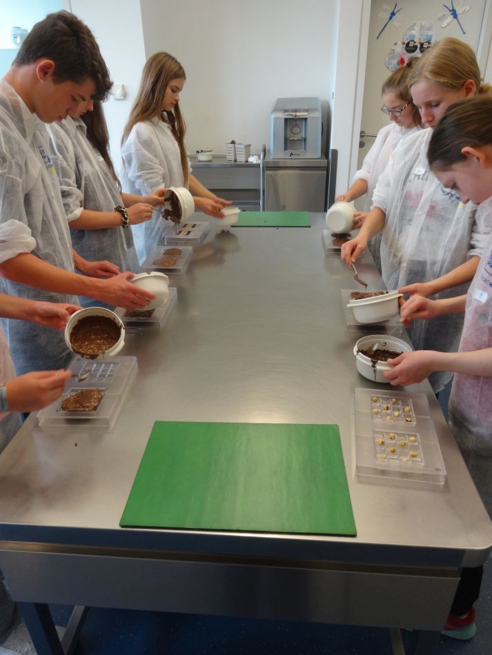 So wanderte man am Freitag bei schönstem Spätherbstwetter zum Uracher Wasserfall, genoss die herrliche Umgebung und stärkte sich naturnah beim gemeinsamen Grillvergnügen. Das Wochenende selbst gestalteten die Gastfamilien individuell, aber bereits am Montag war die Gruppe wieder gemeinsam on tour. Der Kletterpark Lichtenstein stand auf dem Programm und bot die Möglichkeit, die eigenen Grenzen auf bis zu fünf Metern Höhe auszutesten. Das Schwabenland hat natürlich auch kulinarisch einiges zu bieten und so wurde der Dienstagvormittag genutzt, um das Werk des Waldenbucher Schokoladenproduzenten Ritter Sport zu erkunden. Nach einer informativen Führung durch das Ritter Sport Museum durften die Schülerinnen und Schüler aber auch selber aktiv werden und in der werkseigenen Schokowerkstatt individuelle Schokoladensorten kreieren. Ganz offensichtlich war dies für viele unserer Gäste ein Highlight der Woche.