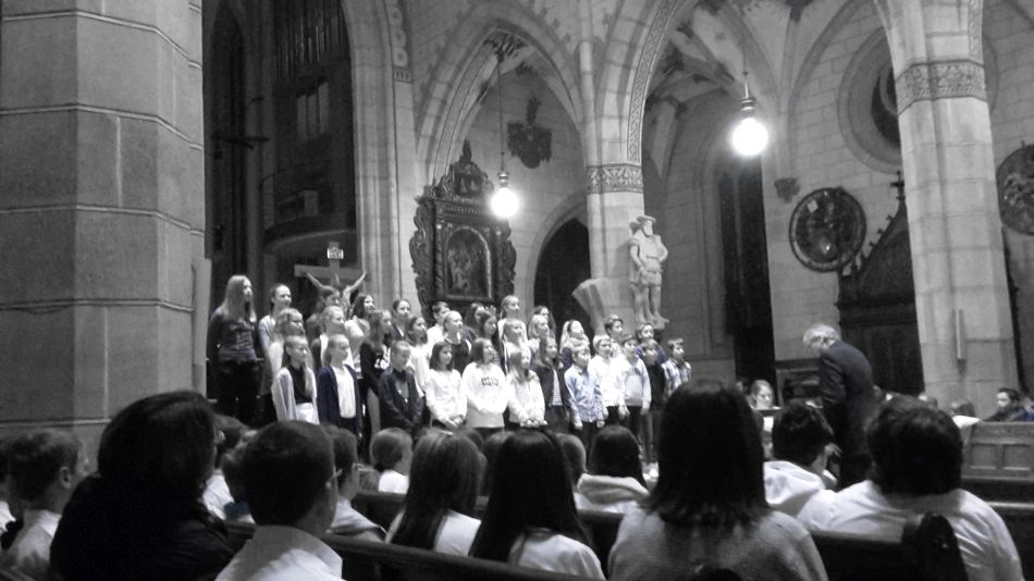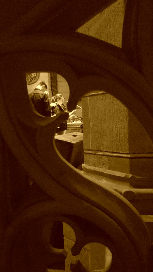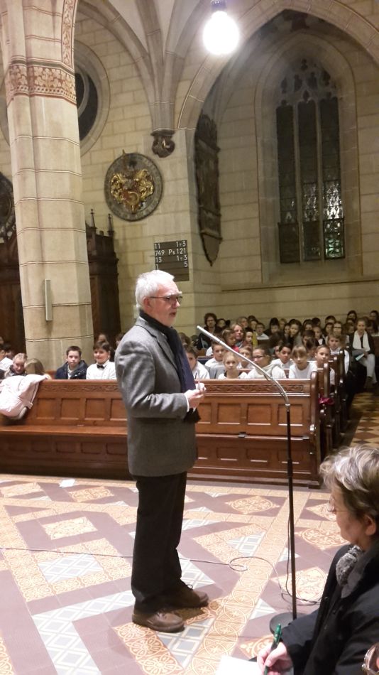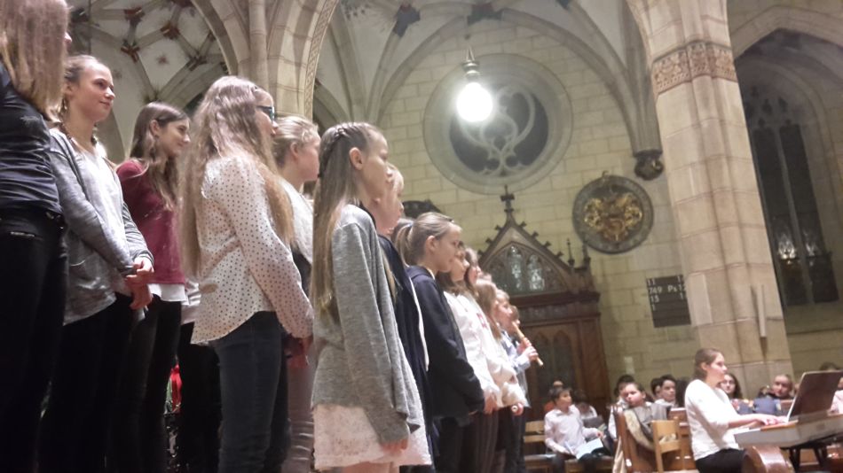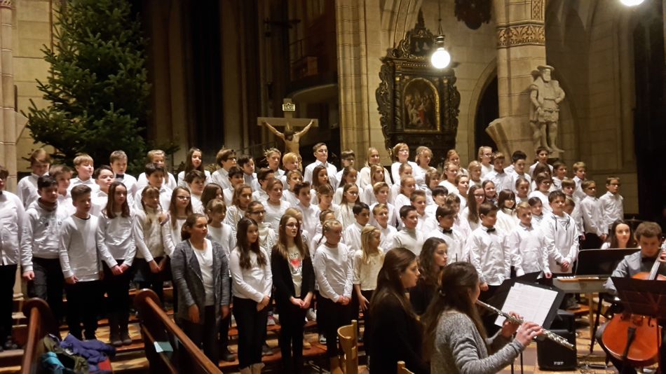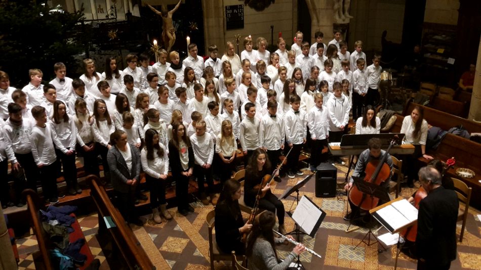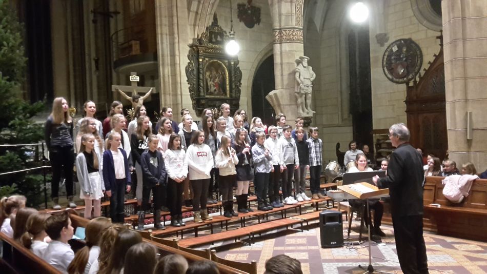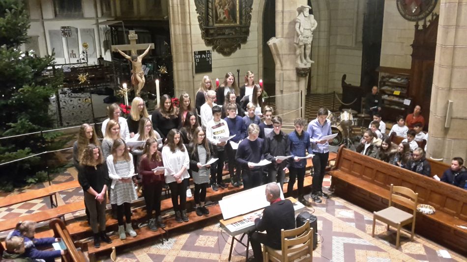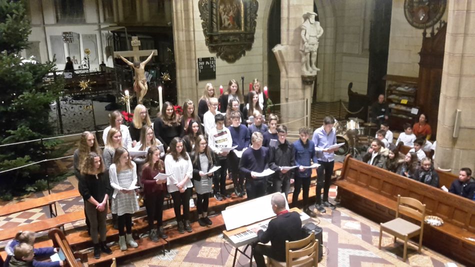 Vor dem diesjährigen Weihnachtskonzert waren durch die Erkrankung der Musiklehrerin Cora-Ann Wagener-Mühleck kurzfristig einige Änderungen nötig geworden, doch davon merkte das Publikum nichts. Joachim Teufel übernahm die Leitung des Chores der Jahrgangsstufen 6/7 und schnell wurde klar, dass die mehrmonatigen Vorbereitungen Früchte getragen hatten. Umrahmt von den hellen Trompetenklängen des jungen Solisten Felix Höhn, der von der Kanzel herab die Hallen der Amanduskirche akustisch zu füllen verstand, präsentierte der Chor eine feine Auswahl unterschiedlichster Weihnachtslieder.