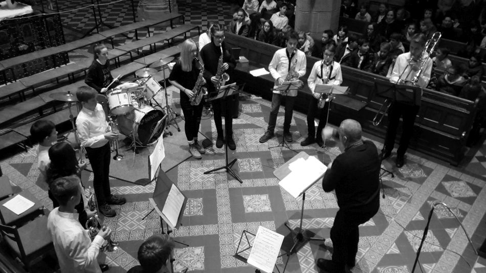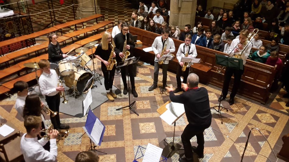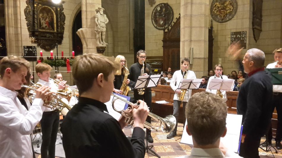 Fröhlich und beschwingt rundete die Big Band, wiederum engagiert geführt von Fritz Schlenker, den Reigen der Aufführungen ab. Der Goldglanz der Blechblasinstrumente ließ den vorderen Teil der Kirche in hellem Licht erstrahlen und bildete auf diese Weise den perfekten Hintergrund für die Botschaft des abschließenden Liedes der Bläser: „We wish you a merry Christmas“
