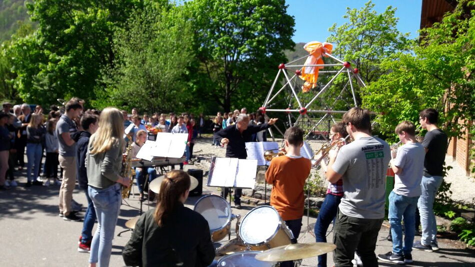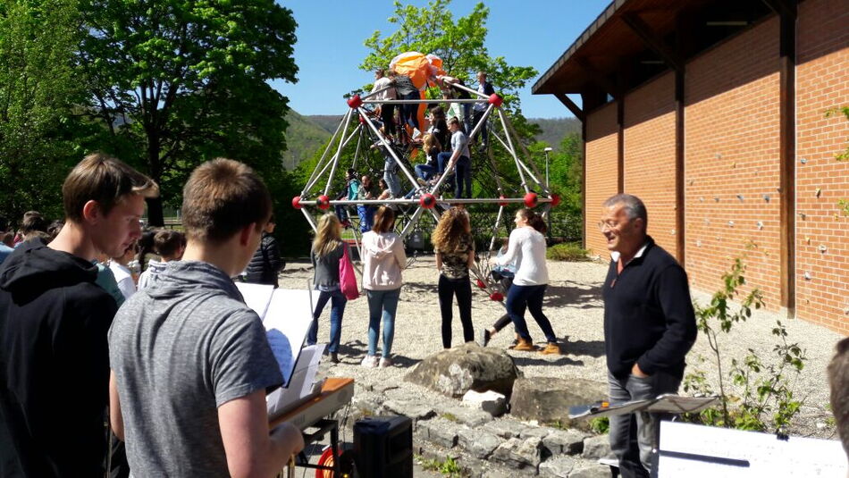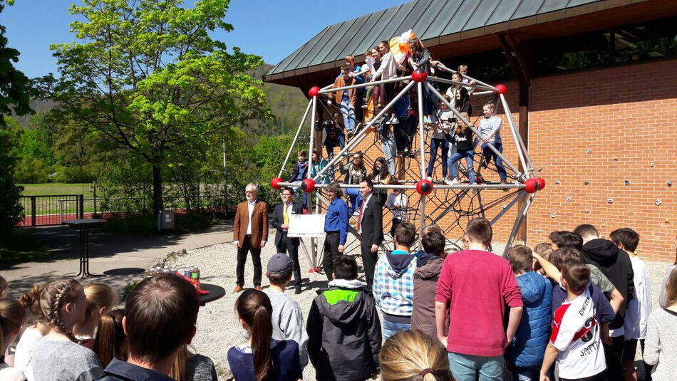 Möglich wurde die Anschaffung des gut 20 000 Euro teuren Objekts durch eine finanzielle Gemeinschaftsleistung der Schulgemeinschaft sowie zahlreicher Sponsoren. Die SMV hatte Gelder aus der letzten Schulrepublik beigesteuert, der Elternbeirat und der Förderverein machten beträchtliche Summen locker und viele kleine und größere Spenden von Privatleuten und Firmen ermöglichten die Investition in den Schulhof, dessen Attraktivität damit einmal mehr erhöht werden konnte. Ein besonderer Dank ging von Rainer Bürck, dem ersten Vorsitzenden des Fördervereins, an einige Schüler, die elf Tonnen Kies in den Untergrund einschaufelten und an den Hausmeister Peter Waimer, der die Arbeiten tatkräftig unterstützt hatte.