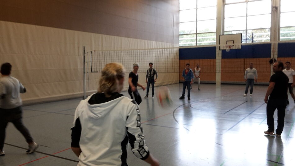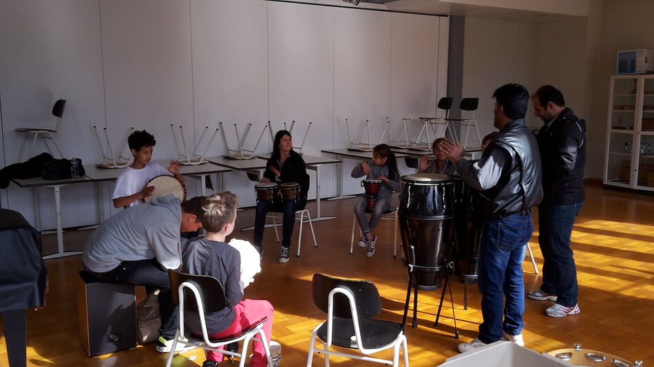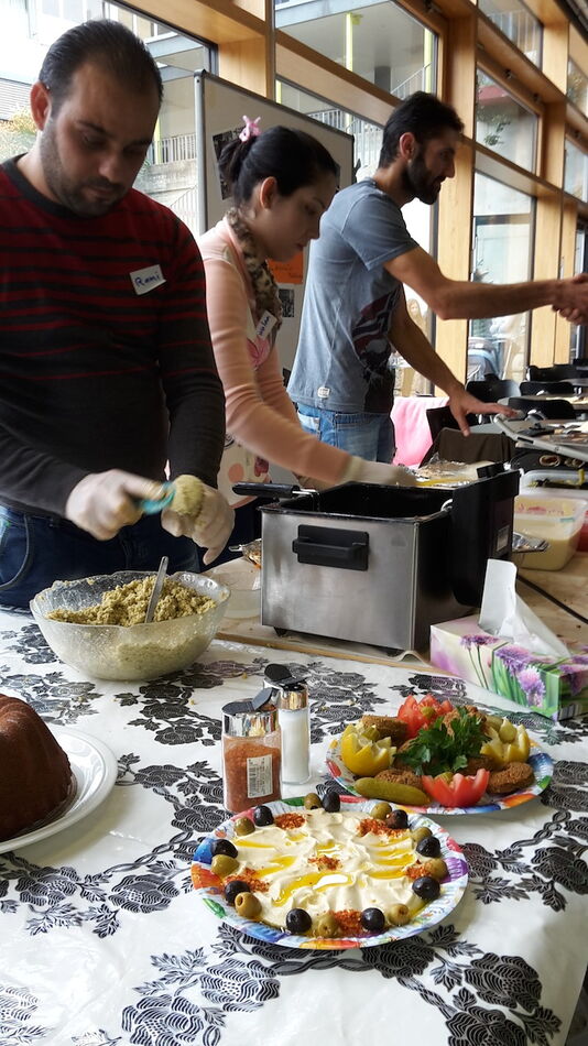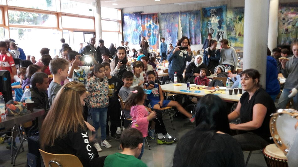 Nach einer kurzen Begrüßung durch die Hauptorganisatorin Ilse Beck und den Schuldirektor Friedemann Schlumberger nahmen die Besucher, je nach persönlichem Interesse, die verschiedensten Angebote wahr. Besonders viel los war in der Turnhalle, wo sich rasch Gruppen zusammenfanden, die Basketball und Volleyball spielten. Auch ein anspruchsvoller Parcour war für Mutige aufgebaut worden. Die Kleineren zogen sich mit ihren Müttern eher aus dem Trubel der Hallen zurück und konnten sich in der Bibliothek Bilderbüchern und Spielen widmen, bzw. sich von engagierten Schülerinnen vorlesen lassen. Richtig lebhaft war es dann aber wieder im Musikraum. Eine bunte Gruppe sorgte hier mit verschiedenen Perkussionsinstrumenten für prächtige Stimmung. Wen der Hunger überkam, trieb es in die Mensa, wo Schüler Waffeln anboten. Doch auch die Geflüchteten selbst wollten ihren Beitrag leisten und so hatte sich eine Gruppe Syrer zusammengetan und bereite frische Falafel zu. All die kulinarischen Köstlichkeiten und unterschiedlichste Getränke wurden umsonst angeboten.