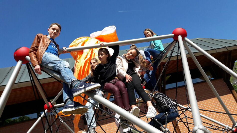 Mit einem kleinen Festakt wurde kürzlich das neue Klettergerät im Schulhof eingeweiht. Seit Januar steht die beeindruckende Konstruktion aus Stahlrohren und Seilen im Schulhof und wird vor allem von den jüngeren Schülern in den Pausen zum Klettern, Hangeln oder auch zum beisammen sitzen genutzt.