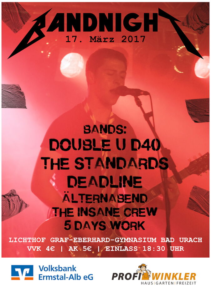 Am Freitag ist es wieder soweit… die Bandnight erschüttert die Hallen des GEG. Insgesamt sechs Bands werden ab 19:00 Uhr ihr musikalisches Können im Lichthof des GEG beweisen: 5 Days Work werden den Anfang machen, gefolgt von der Insane Crew. Mit Älternabend werden drei Lehrer des GEG ihre dadaistisch-moderne Interpretation der 80iger Jahre präsentieren. Rockig wird der Abend mit den Jungs von Deadline, The Standards und Double U D40 zu Ende gehen.