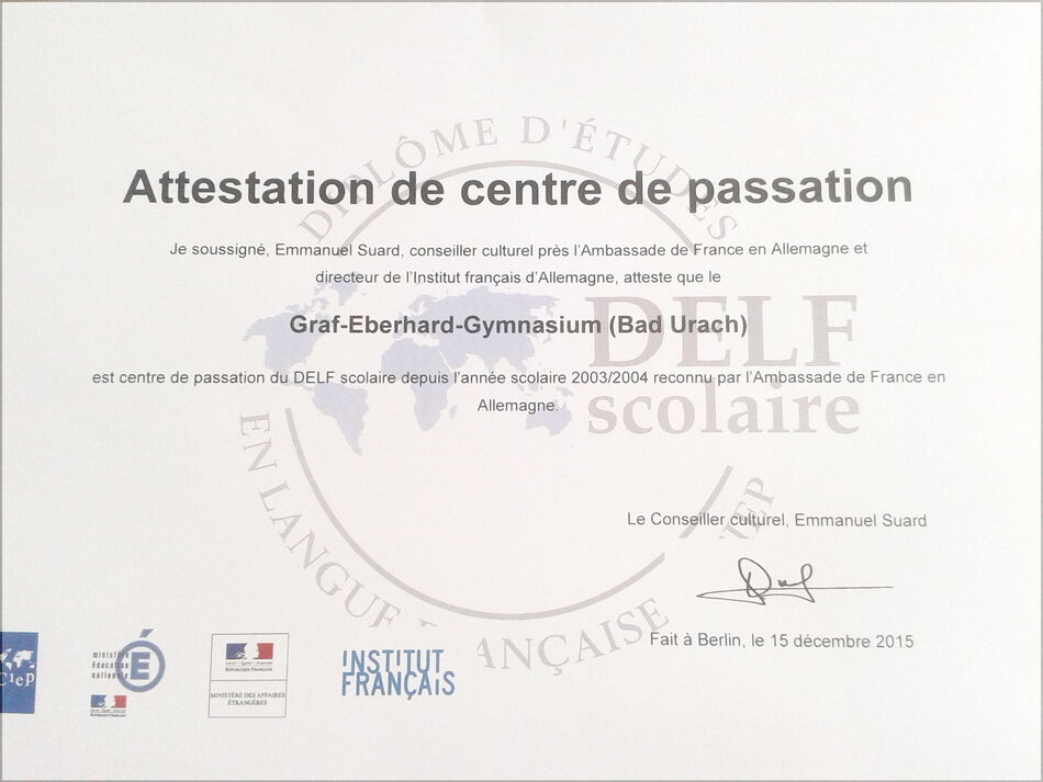 Am Freitag den 7. März nahmen Susanne Kiesel und Ilse Beck im Tübinger institut culturel franco-allemand die Urkunde zur Anerkennung langjähriger DELF Partnerschulen für das Graf-Eberhard Gymnasium entgegen.