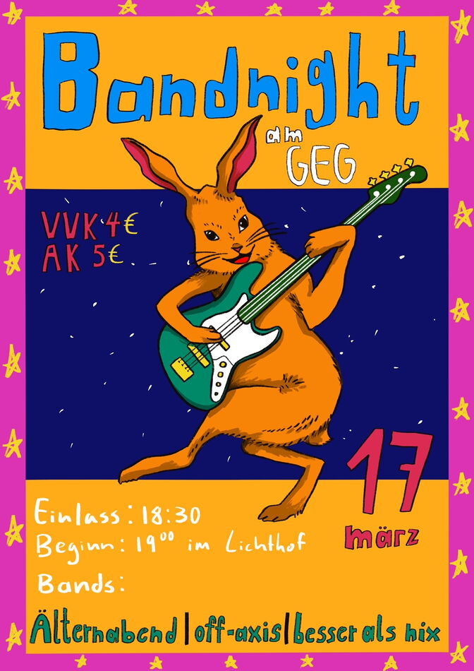 Am kommenden Freitag findet am GEG die traditionelle Bandnight statt. Die Pandemie hat zwar auch beim musikalischen Leben an unserer Schule ihre Spuren hinterlassen, aber ein paar Überzeugungstäter rotten sich immer noch - oder wieder - im Bandraum der Schule oder in privaten Proberäumen zusammen und machen IHRE Musik, die sie bei der Bandnight live aufführen!
